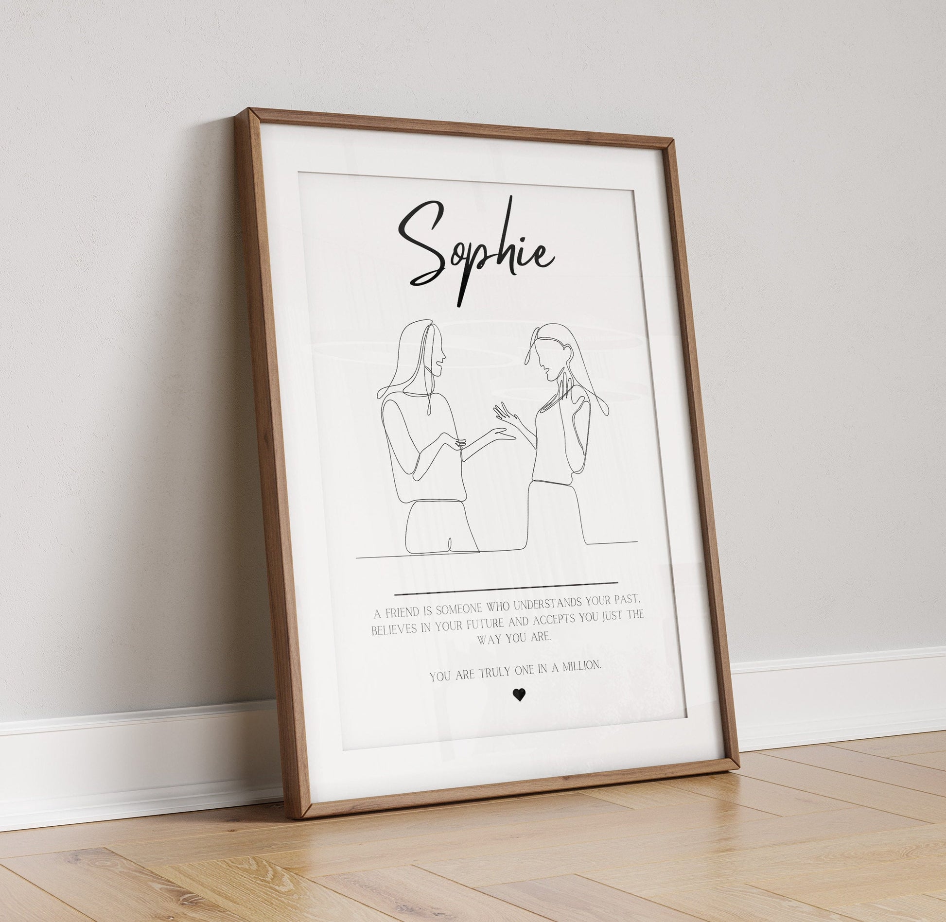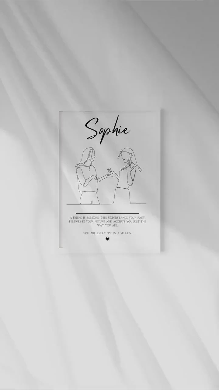 This beautiful friendship line art print is the perfect gift to give to your friend to showcase how special they are. Personalised with their name and a beautiful quote that reads 'A friend is someone who understands your past, believes in your future and accepts you just the way you are. You are truly one in a million.'