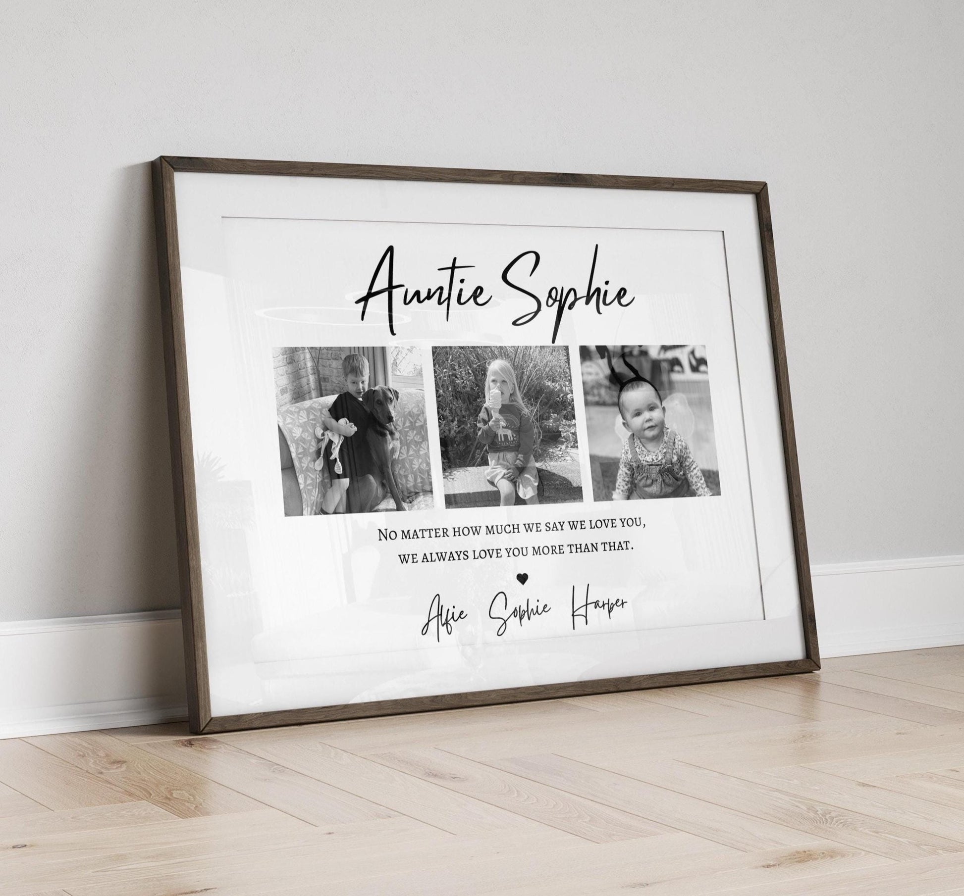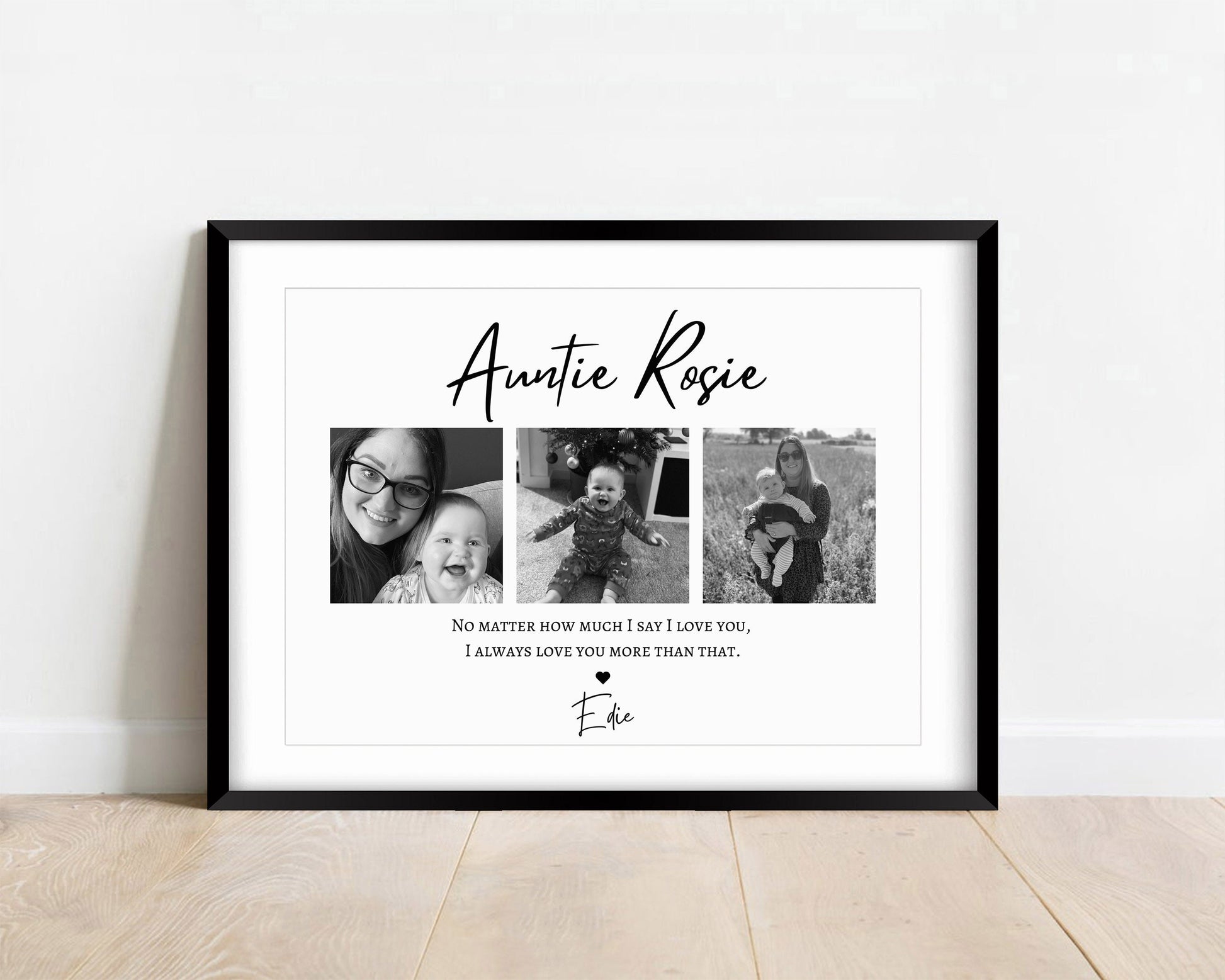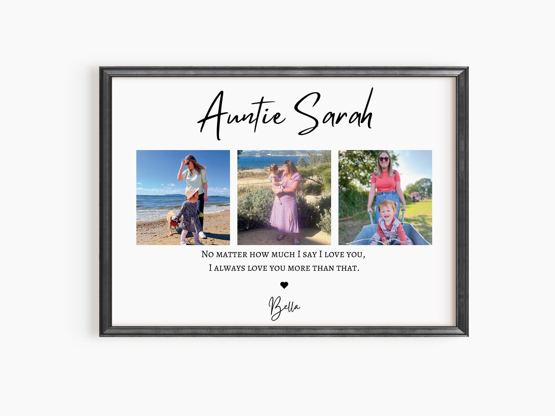 Treat an incredible Auntie with this sentimental and beautiful customised photo print. Fully personalised to order with photos that capture the wonderful relationship with the Aunts name, the children/s name and a quote that reads 'No matter how much I/we say I/we love you, I/we always love you more than that.'