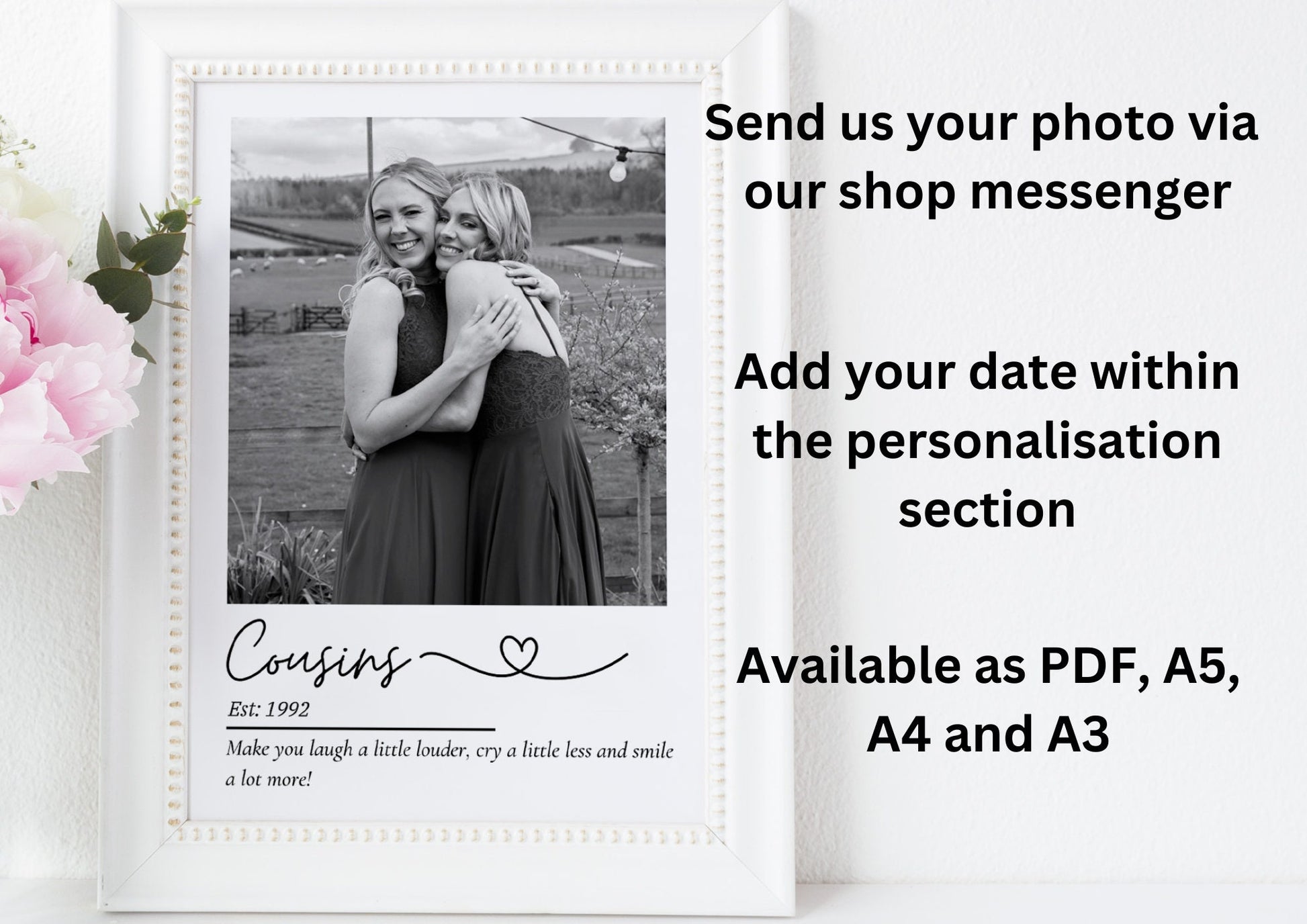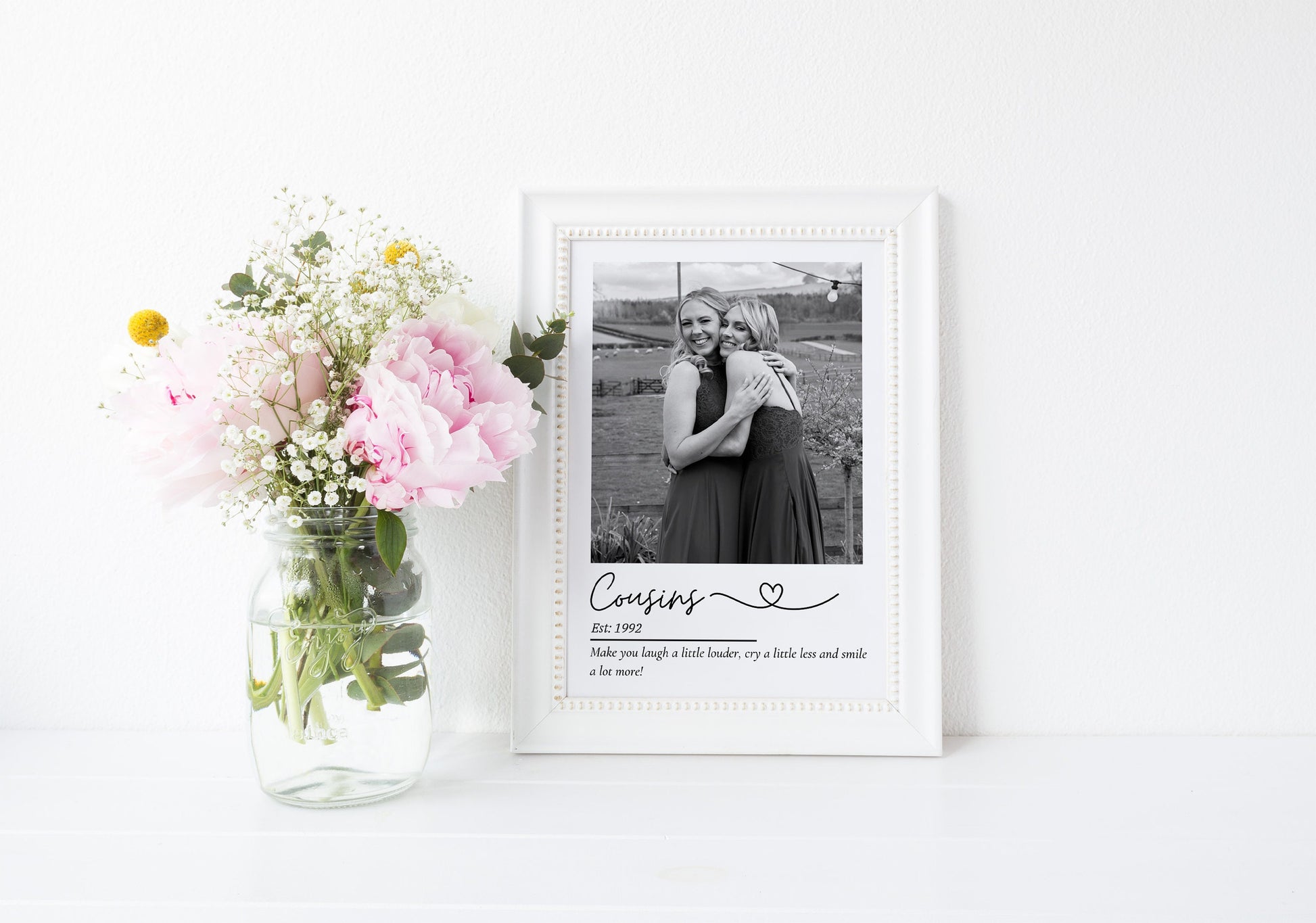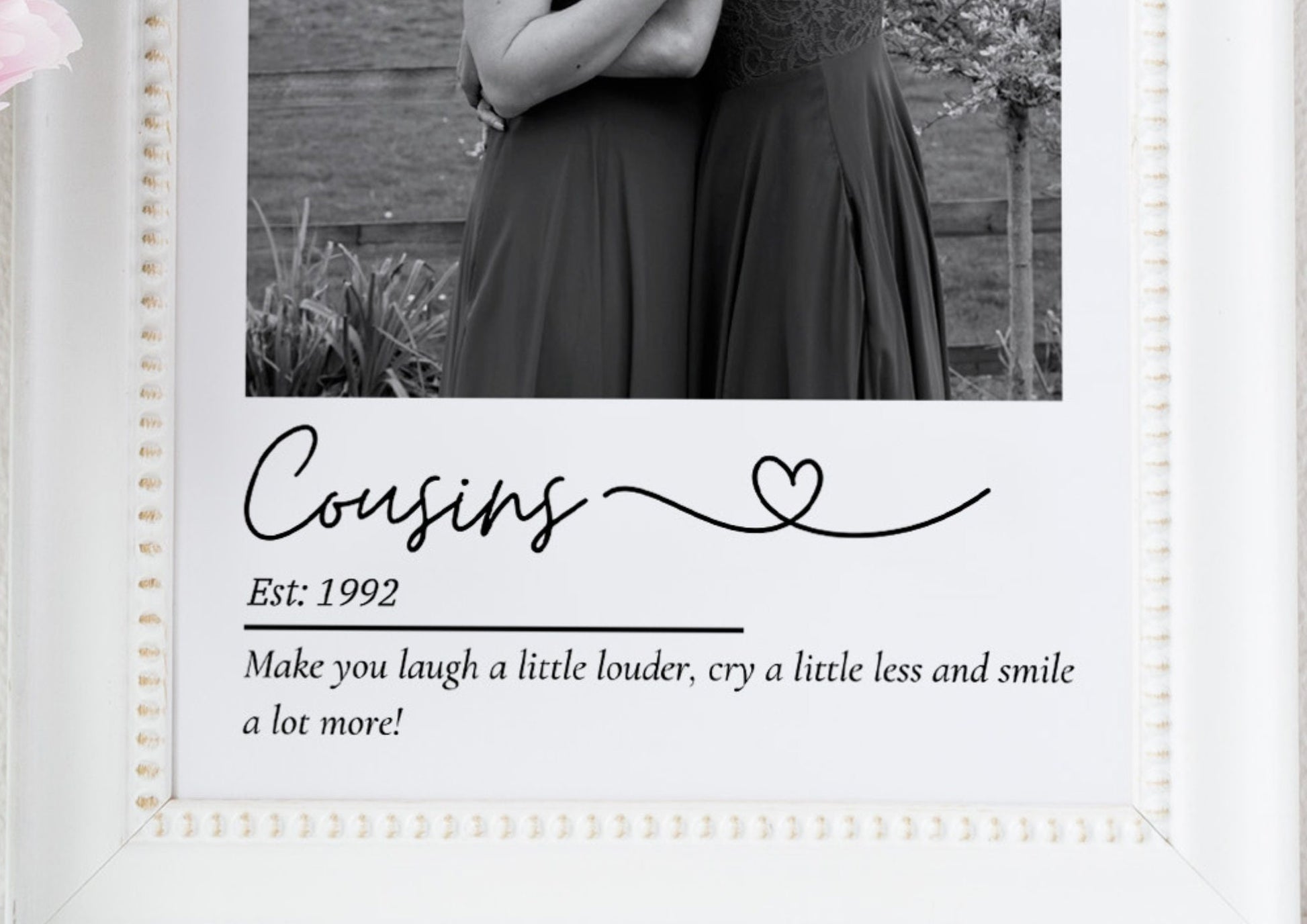 Treat an incredible Cousin with this sentimental and beautiful customised print. Fully personalised to order with a photo that captures the wonderful relationship and the year established date finished off with a quote that reads 'Make you laugh a little louder, cry a little less and smile a lot more!' This design captures the incredible relationship shared between loving cousins.
