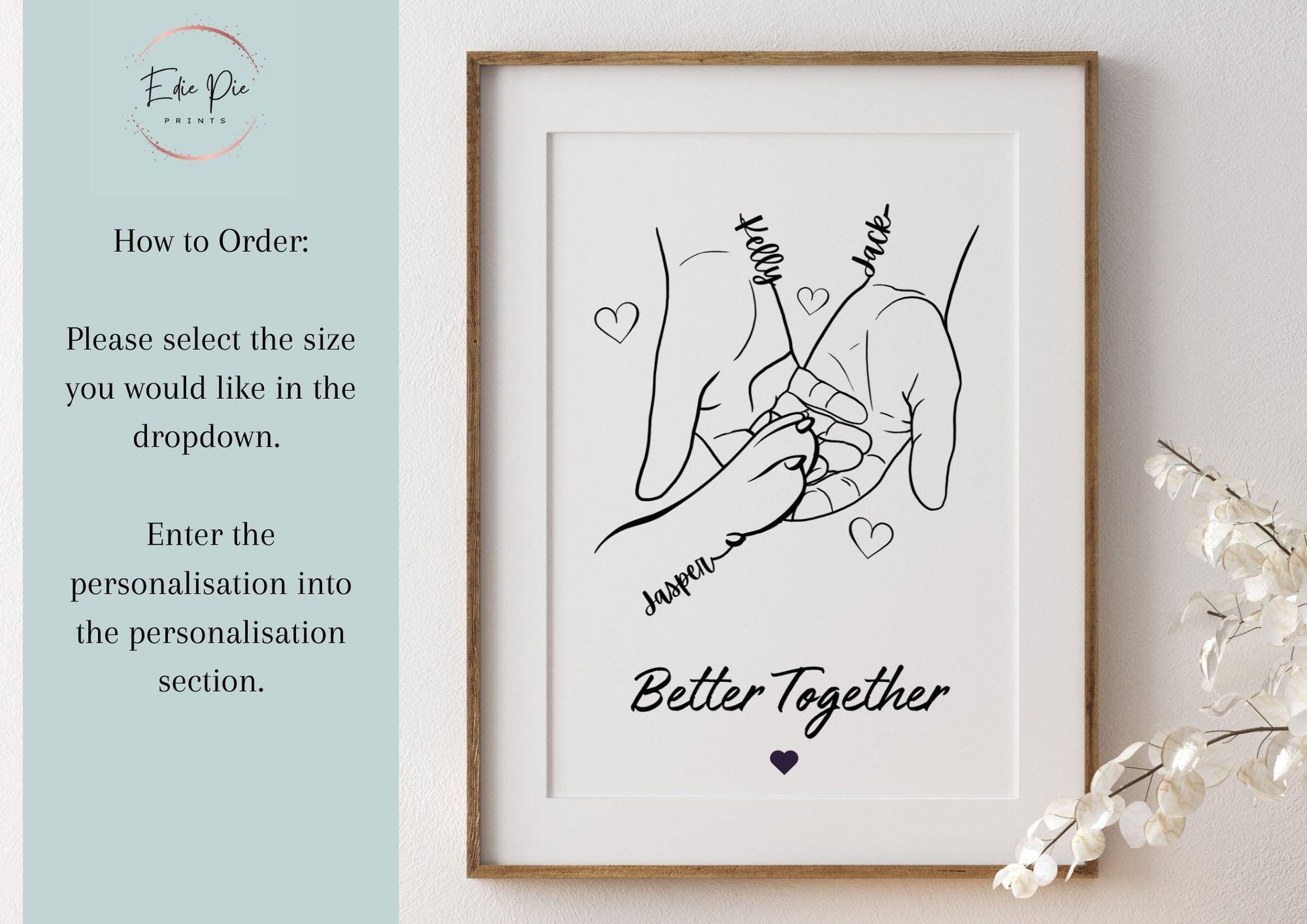 We are a home-based small printing business in Salisbury, UK. Our print business was inspired by our beautiful little girl Edie. All prints in our shop are designed by us and are created around home and wedding decor to accompany any style you choose. Our prints are sent frameless to give you the peace of mind that you can decide what style, colour, and design you would like in your living space or wedding.