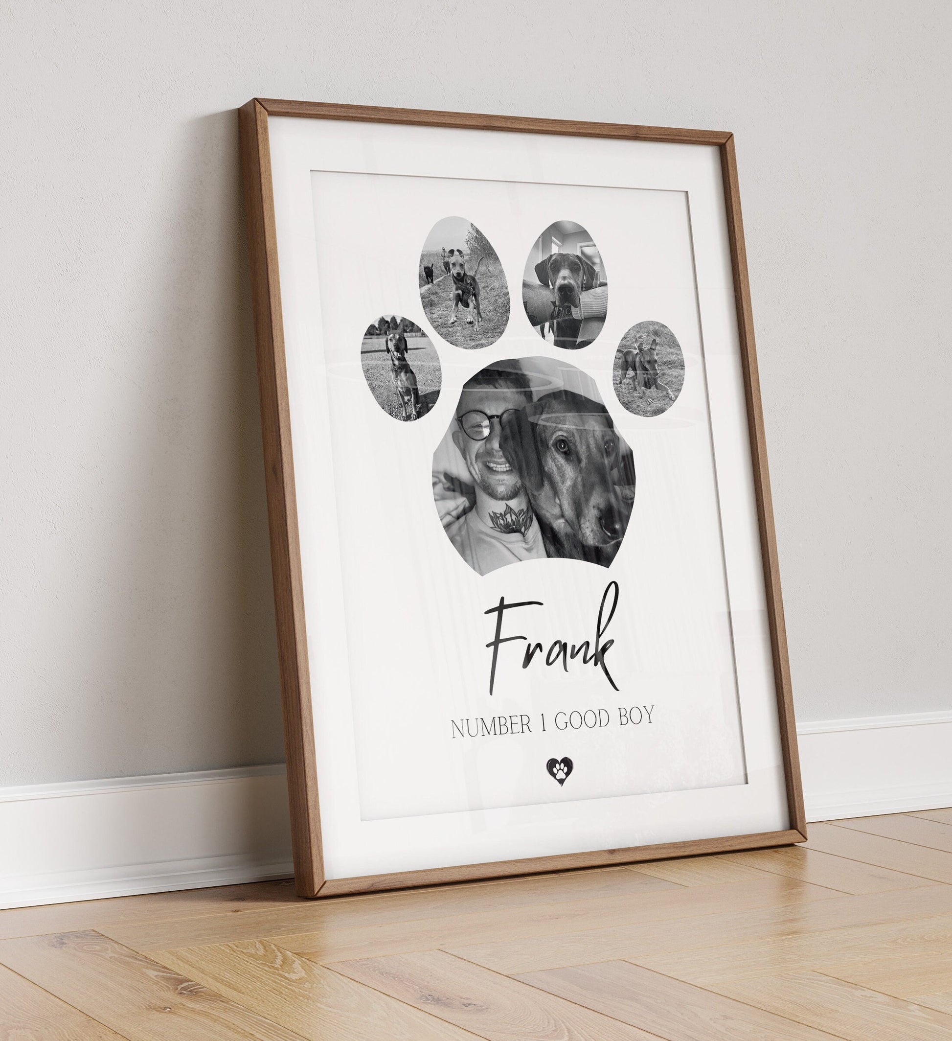 This stunning Dog photo print captures 5 photos of your choice which we will add into the print. Beneath these lovely photos we have the dogs name and a quote that reads 'Number 1 Good Boy.' Captures on our clean 220gsm Matte Photo Card sold unframed as PDF, A3, A4 or A5. This is a stunning piece which could be the perfect pet memorial, celebration of a new member of your family or just a lovely gift to one of your dog owner friends. Available in black and white or in colour.