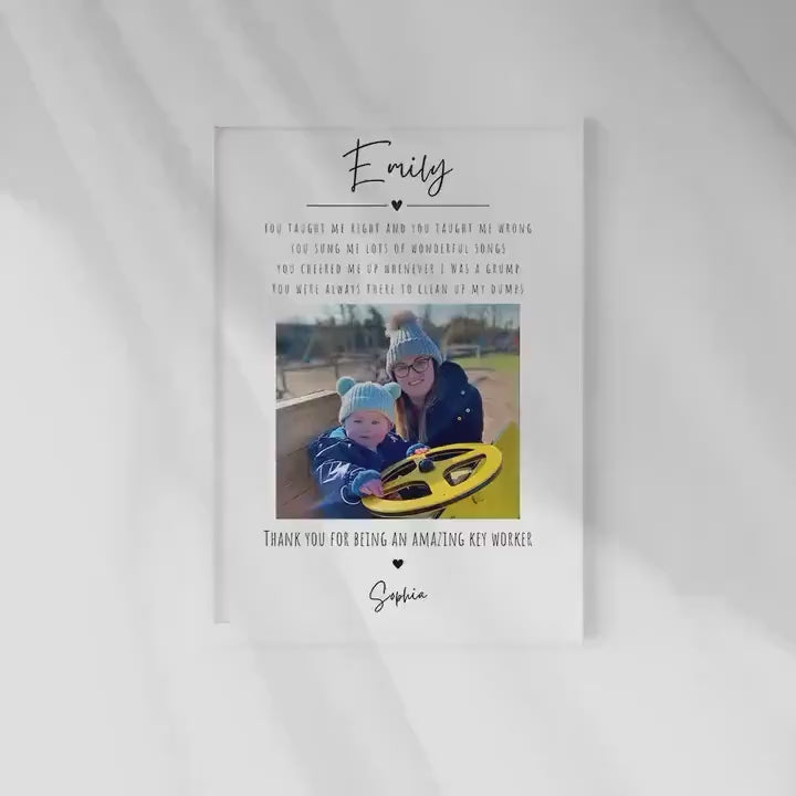 Our personalised Nursery Key Worker thank you gift print is the perfect gift for a special teacher, key worker or nursery staff member from your son or daughter. Capturing a lovely thank you message with a special photos for them to say thank you for their hard work. This five star premium wall art is available in a range of sizes and is fully changeable to your requirements. With the name of the recipient, quote that reads 'You taught me right you taught me wrong, you sung me lots wonderful songs, you cheered me up whenever I was a grump, you were always there to clean up my dumps.' Then another quote that reads 'thank you an amazing key worker/ nursery worker'.