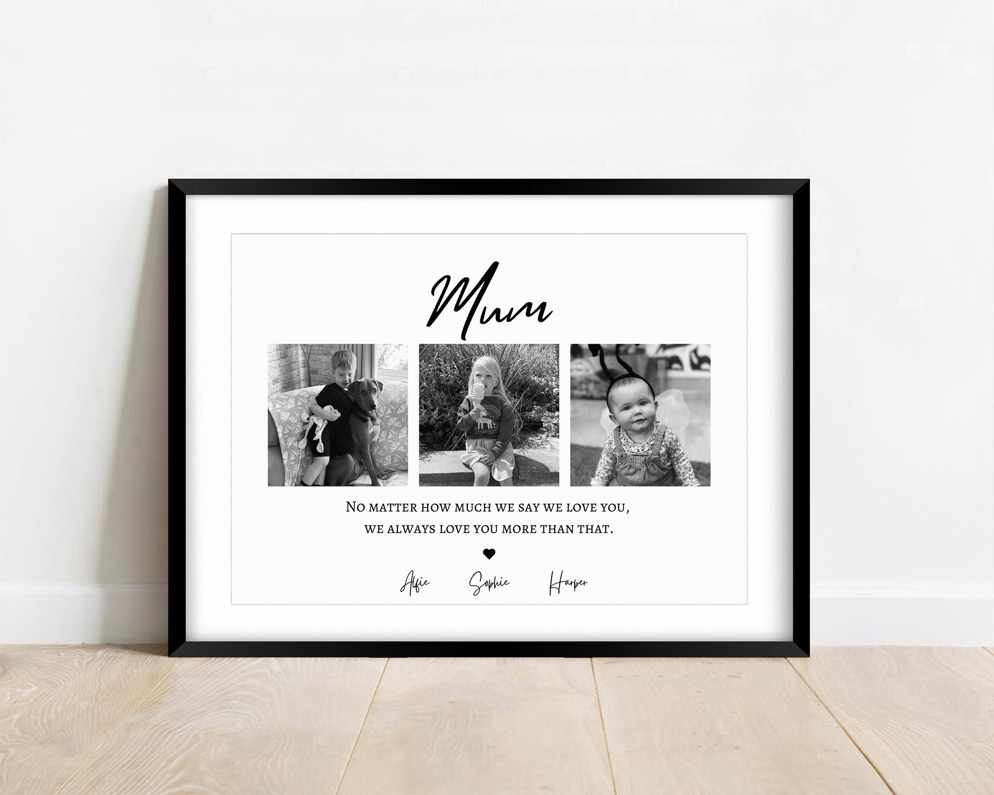 Treat an incredible Mum with this sentimental and beautiful customised photo print. Fully personalised to order with photos that capture the wonderful relationship, the children/s name and a quote that reads 'No matter how much I/we say I/we love you, I/we always love you more than that.'