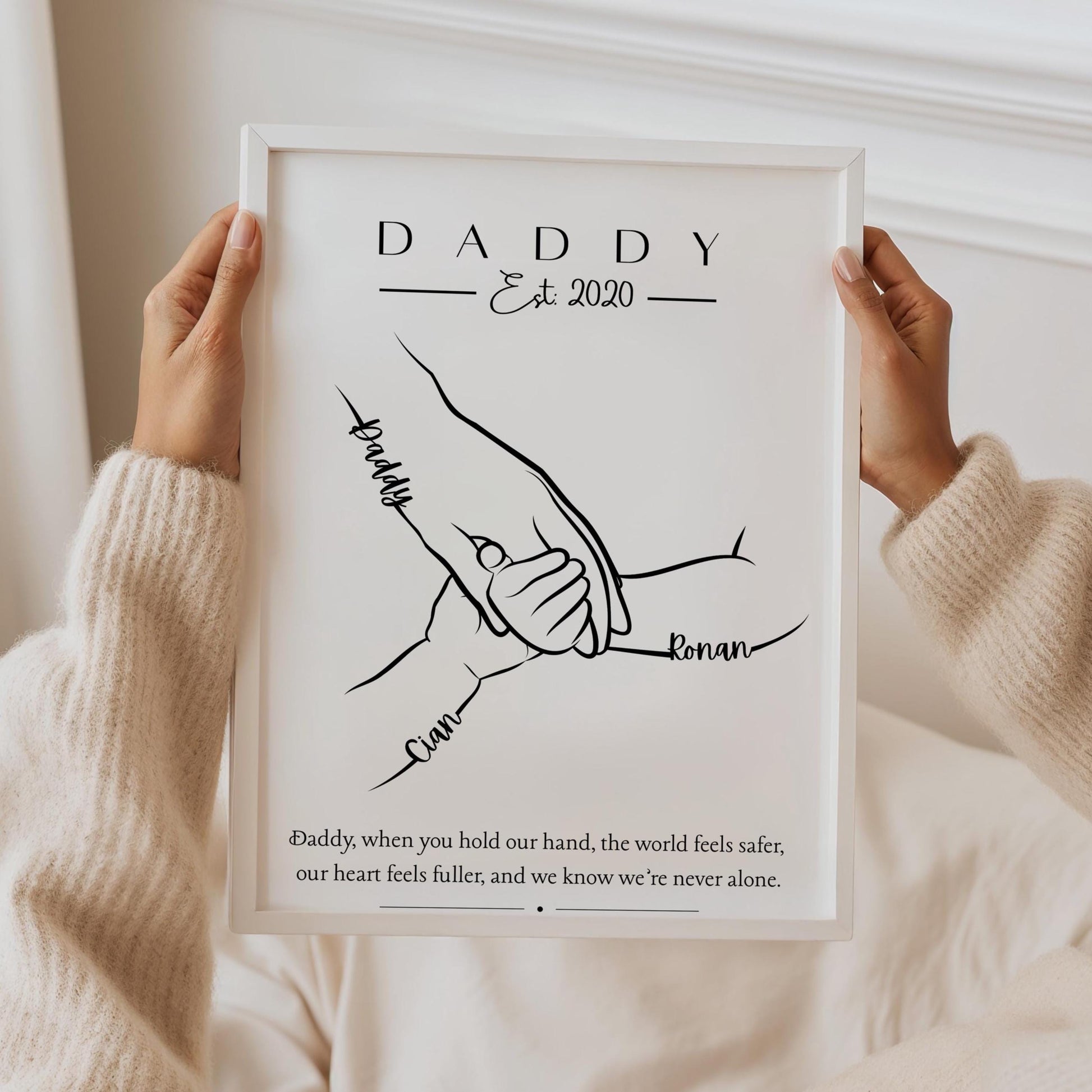 Looking for a meaningful gift for a special dad? This personalised handprint art is a beautiful way to celebrate the bond between a father and his kids. Each print features a miniamlist line drawing of dad's hand holding his children's hands, with their names and the year he became a father.