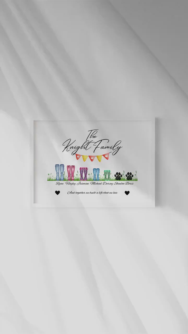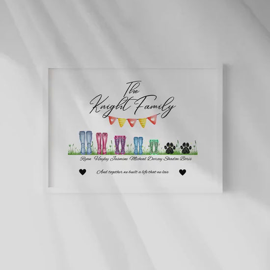 Our Family Custom Made Welly Boot Print. A variety of coloured wellies to choose from. You can also add dogs print or cats print and enter each family members name. This personalised family print also comes with a beautiful quote saying ''And together we built a life that we love''.