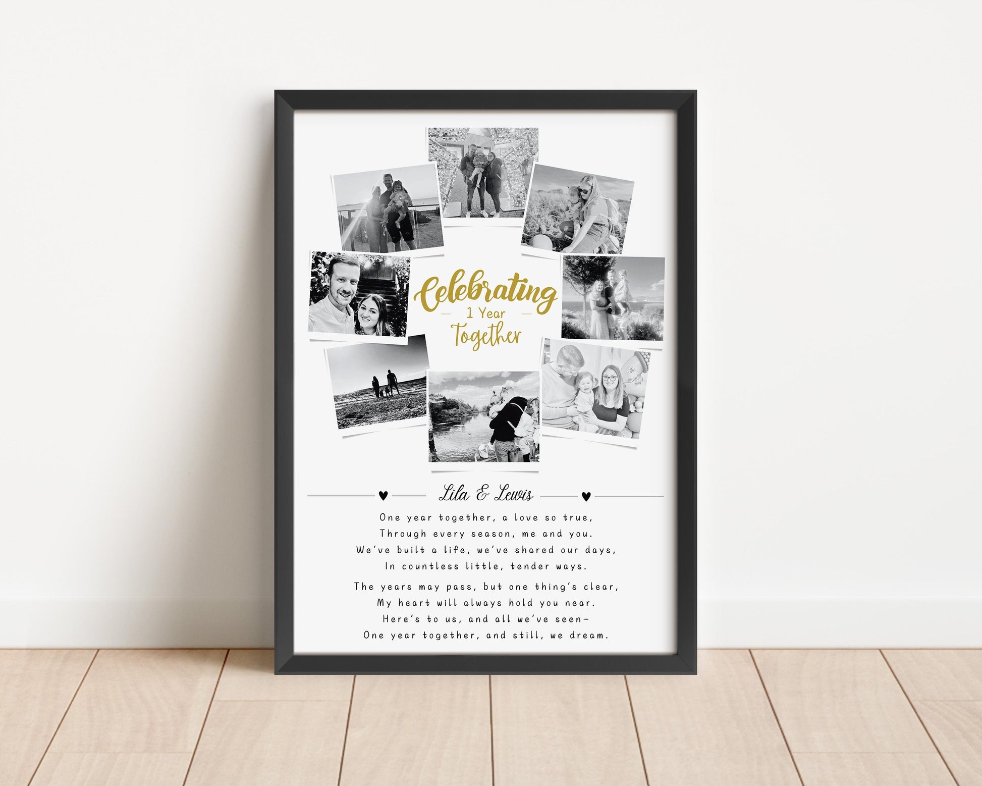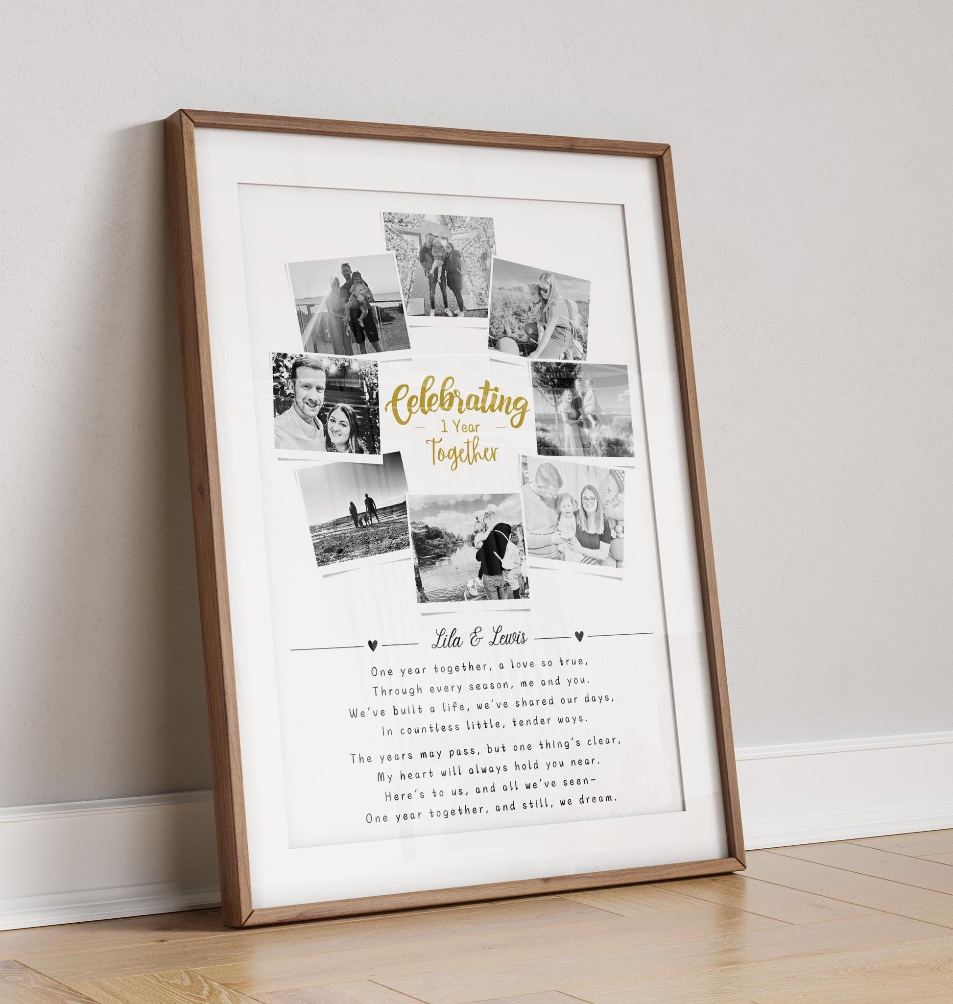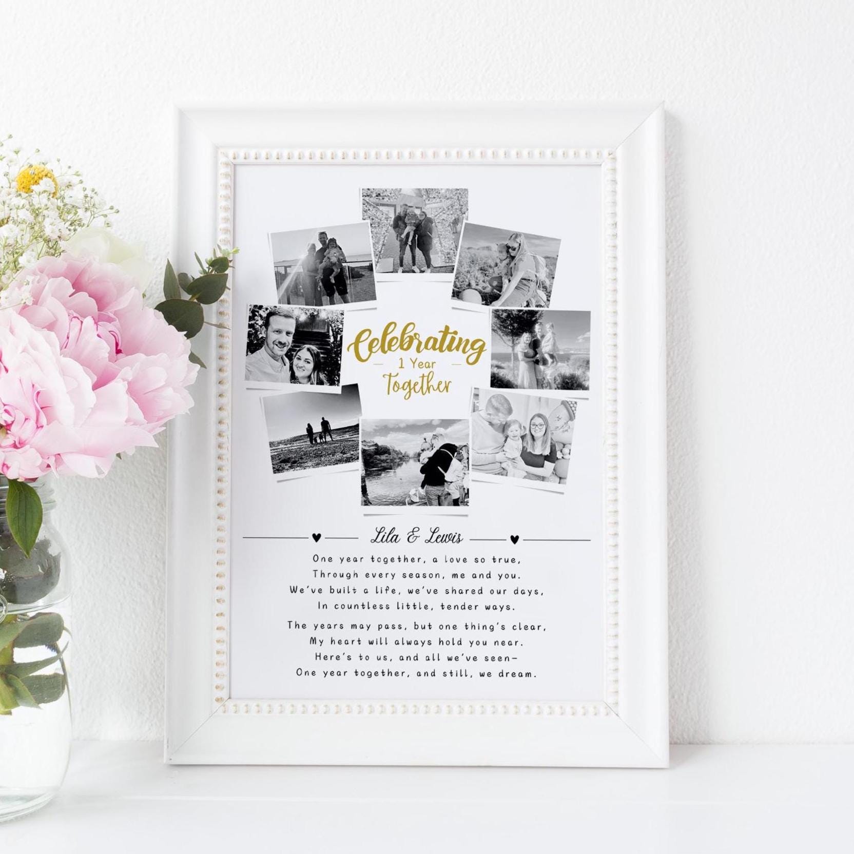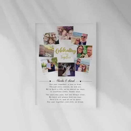 Celebrate the beauty of love and memories with this beautifully personalized 1st Anniversary photo print. Featuring 8 photos of the couple, this custom design captures the essence of your relationship while showcasing the heartfelt poem: