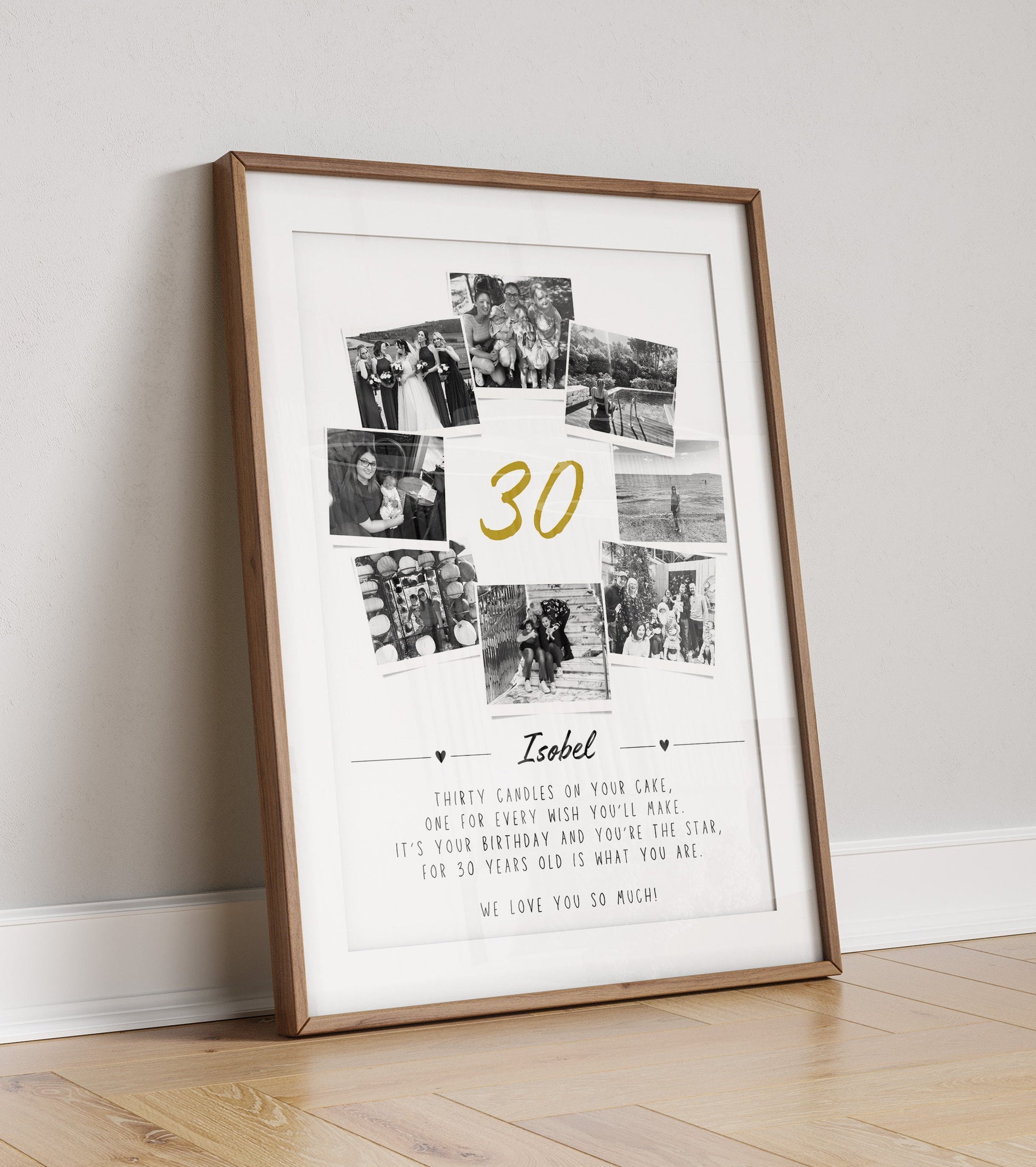 Celebrate a wonderful 30th birthday with this stunning photo collage print capturing 8 stunning photos and a gorgeous quote that reads 'Thirty candles on your cake, one for every wish you'll make. It's your birthday and you're the star, for 30 years old is what you are.' This quote can be changed upon request.