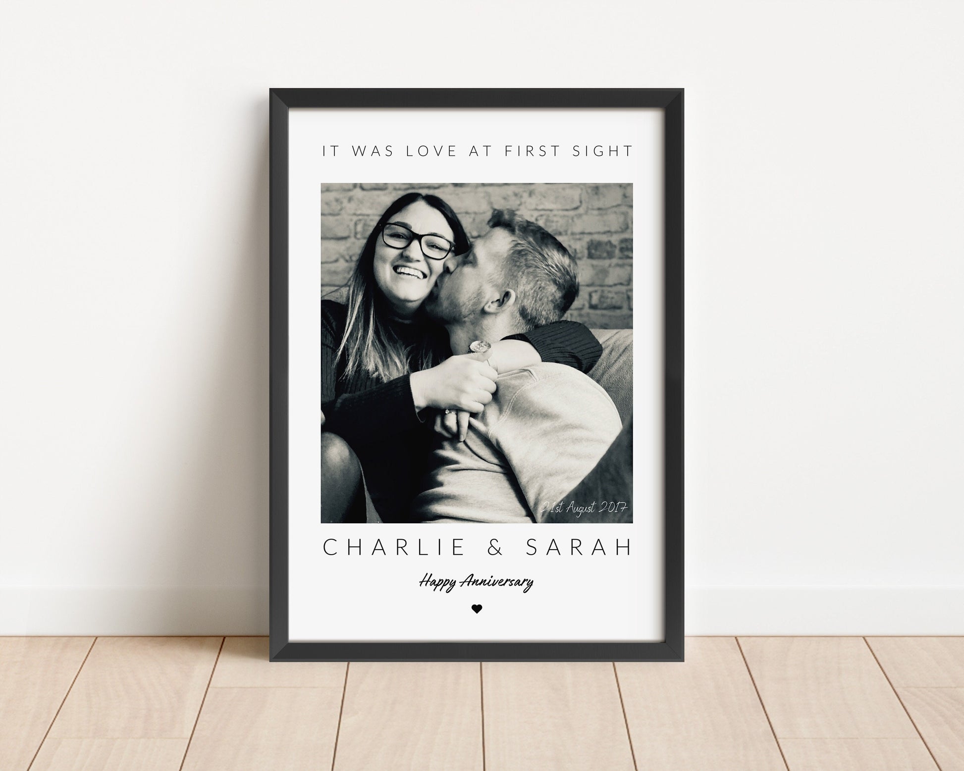 Fully personalised to order with the top line quote stating 'It was love at first sight' and the line under the photo can have 'Mr and Mrs Surname', The first names or wording of your choice, then underneath happy anniversary or first anniversary. It truly can be fully edited to your requirements.