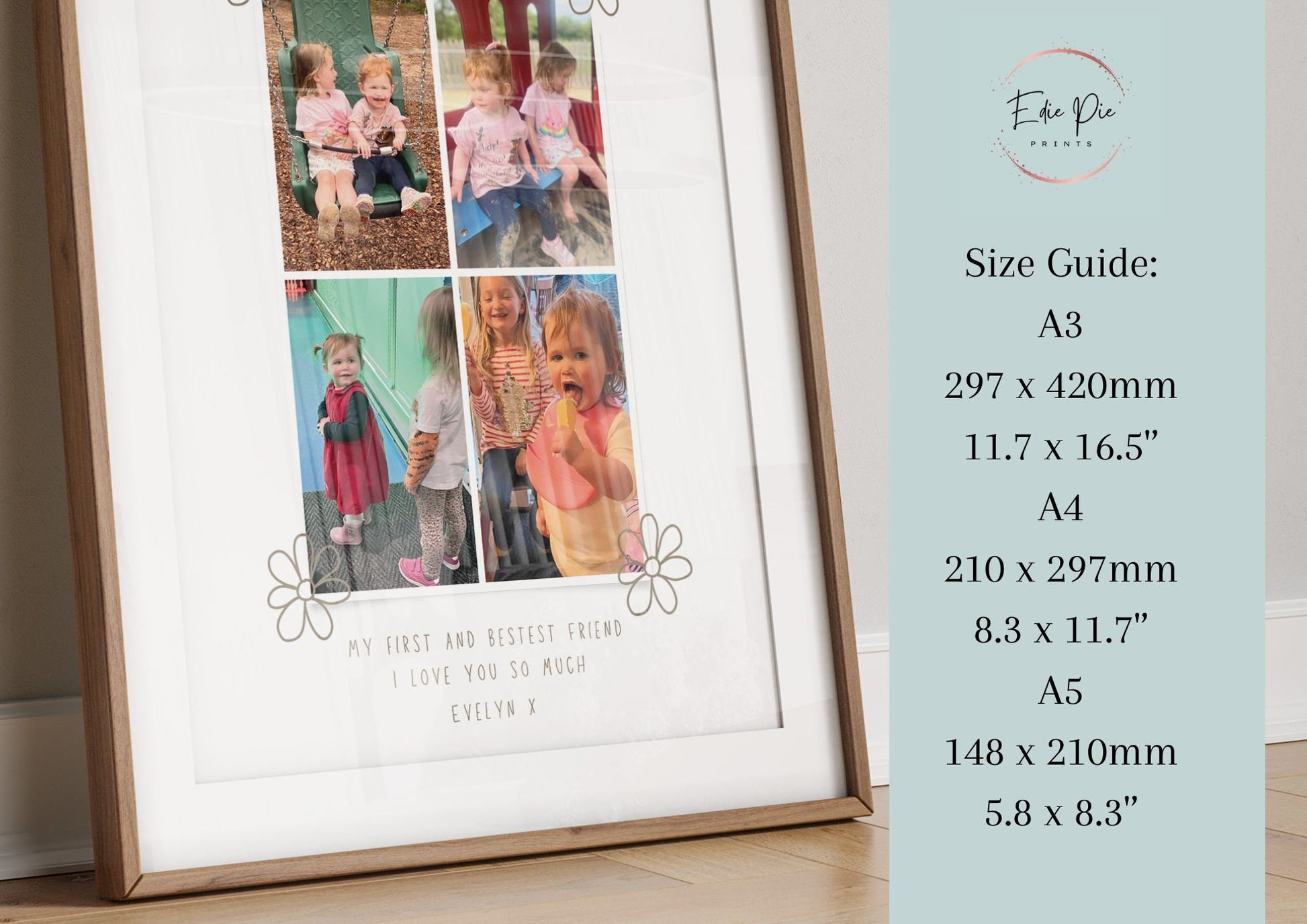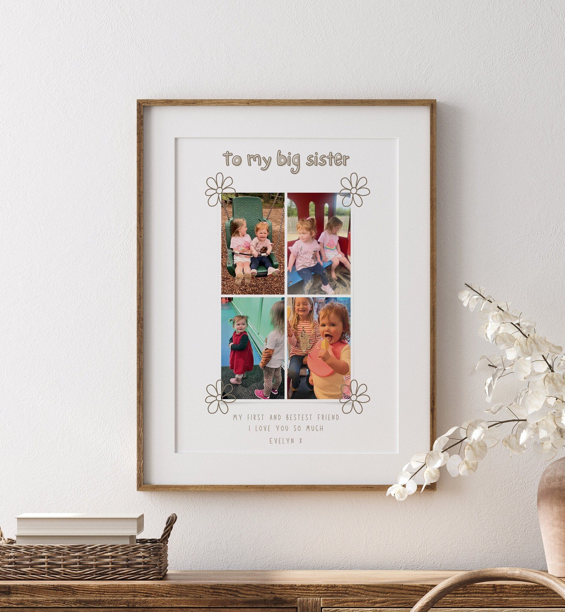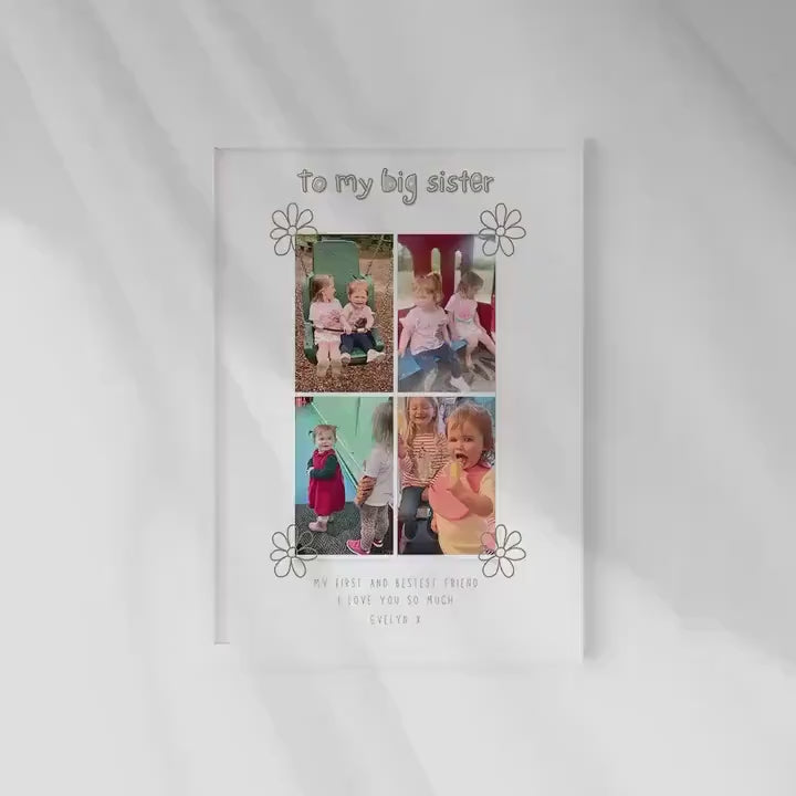 This stunning big sister photo gift is a wonderful piece for any new or growing big sister. A present designed to capture 4 wonderful photos from their little brother or sister. This print also has a lovely message that reads 'My first and bestest friend. I love you so much.' Then signed off with the name of the individual the print is from.