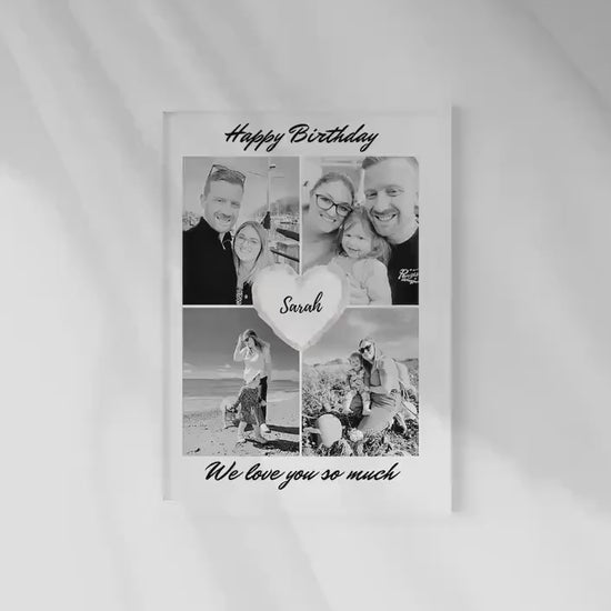 Introducing our Personalised Happy Birthday Photo Print - A Unique Gift to Celebrate Their Special Day! Celebrate someone's special day with a custom, one-of-a-kind birthday photo print! This beautiful print features 4 of your favorite photos in black and white, with a heart-shaped design in the center showcasing their name. The top of the print includes the message "Happy Birthday" and the phrase and at the bottom "We Love You So Much" to make it extra special. The quote is totally changeable so please specify any specifics in the personalistion section.