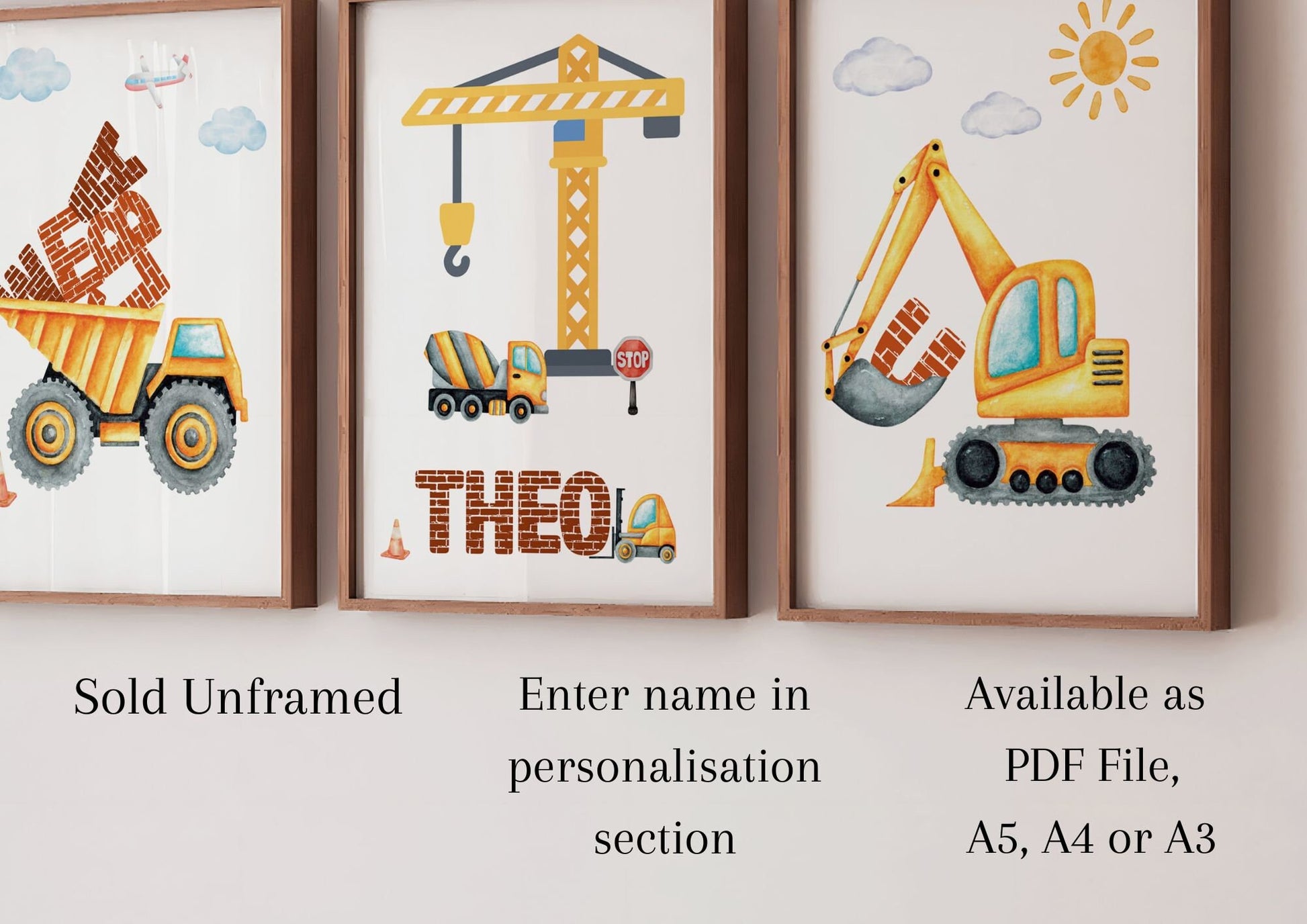 Personalised Construction Bedroom Print Set, Diggers and Trucks Nursery Decor, Vehicle Wall Art, Childrens Building Art, Sons Bedroom Decor