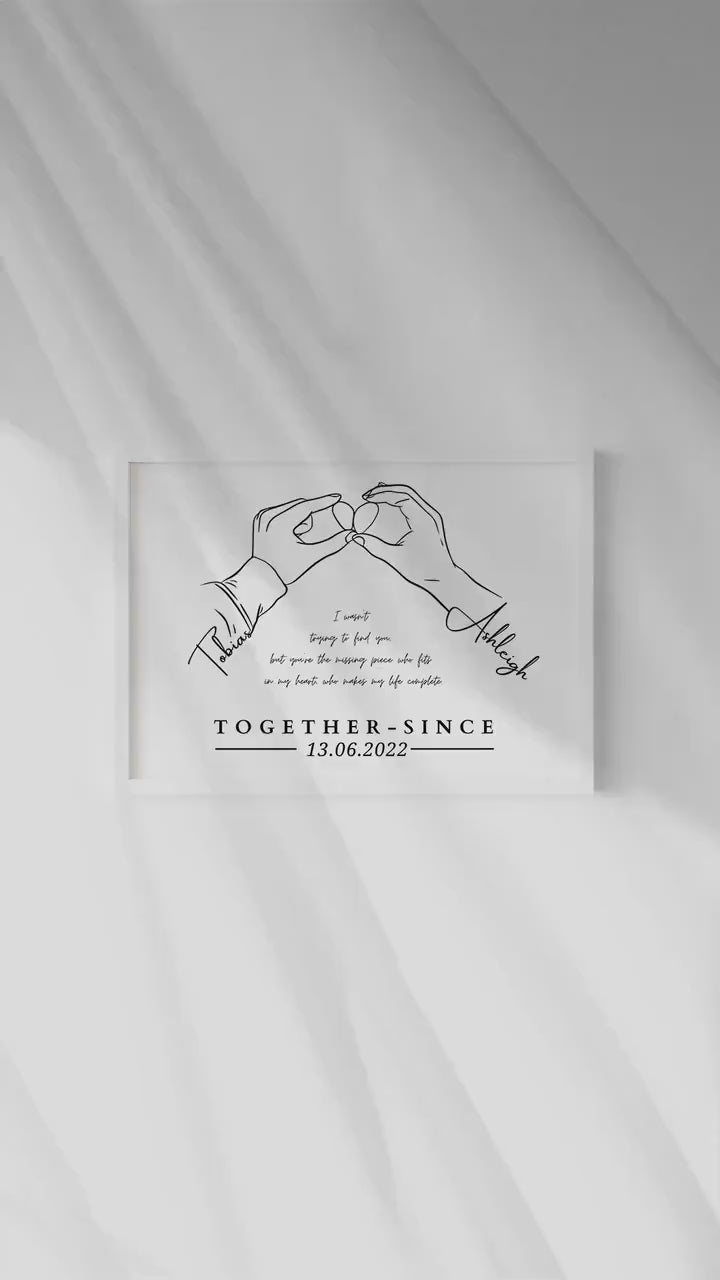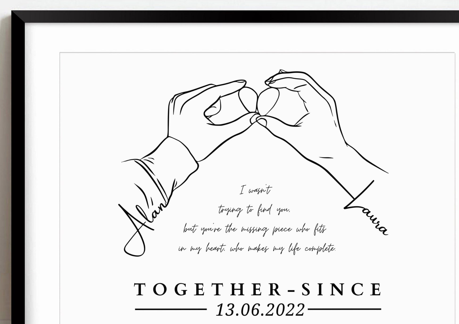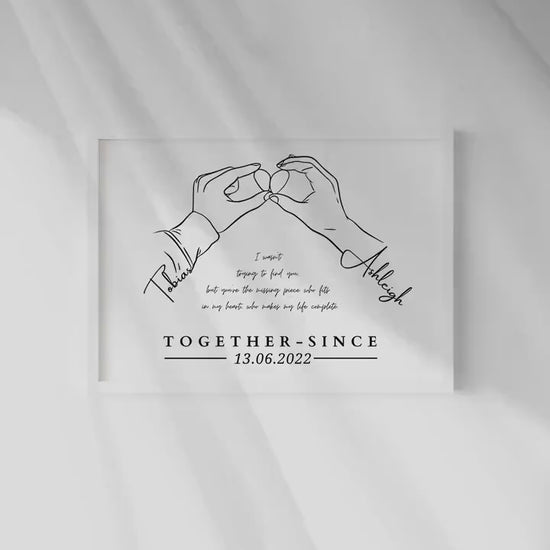 Celebrate your love with this personalised hands line art print, featuring two hands holding matching heart puzzle pieces. Add your names, a special date, and the quote "Together Since" for a meaningful and unique keepsake. This elegant, minimalist design makes a perfect anniversary, wedding, or engagement gift. Printed on high-quality paper with optional framing available to suit your space.