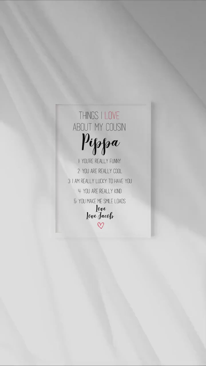 Treat a beautiful Cousin with a lovely sentimental gift this Birthday or Christmas with this unique personalized 'Reasons I love' wall hanging. A way to capture all those beautiful things that makes your cousins truly incredible. Designed to be one in a million for your cousins. A wonderful gift with a beautiful meaning.