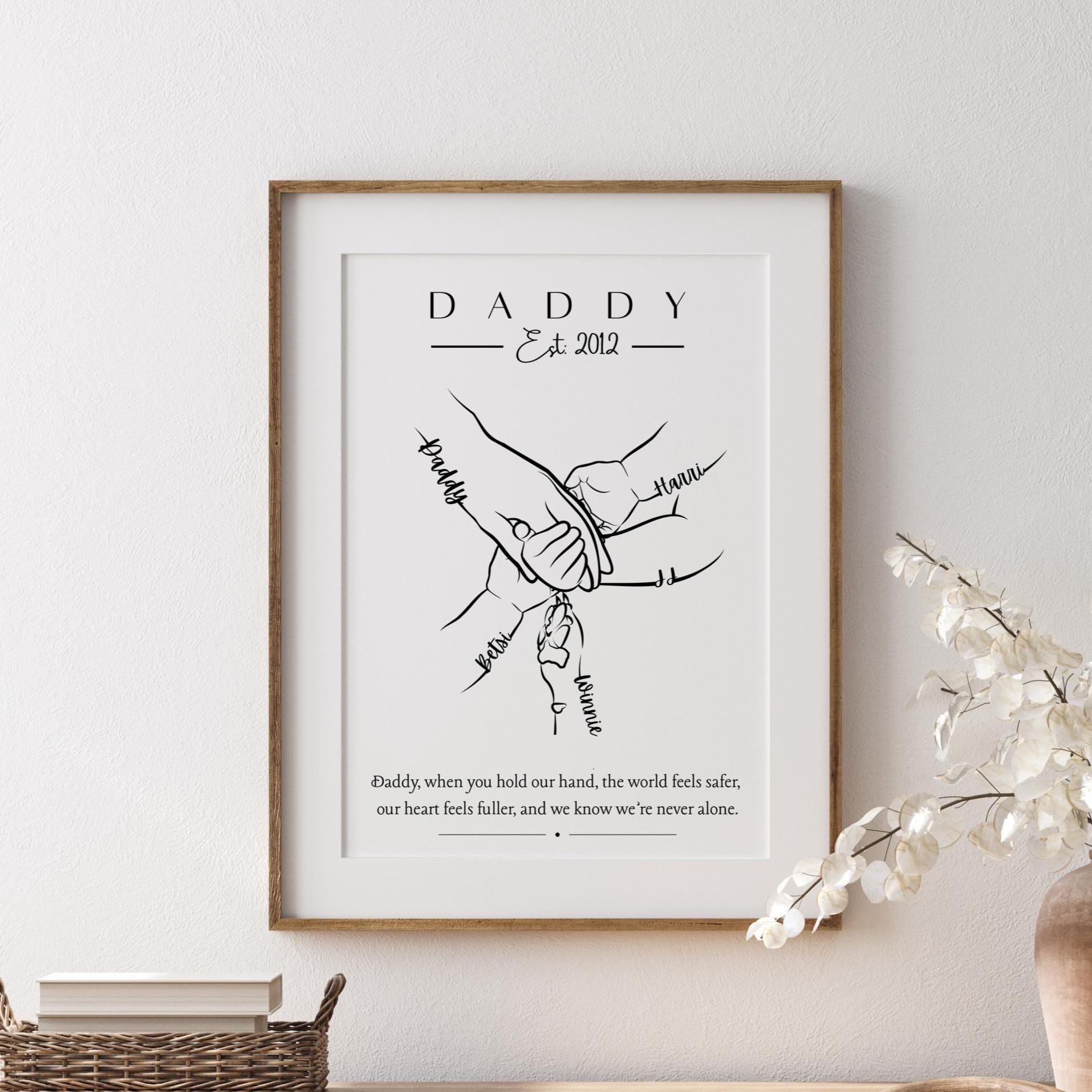 Looking for a meaningful gift for a special dad? This personalised handprint art is a beautiful way to celebrate the bond between a father and his kids. Each print features a miniamlist line drawing of dad's hand holding his children's hands, with their names and the year he became a father.