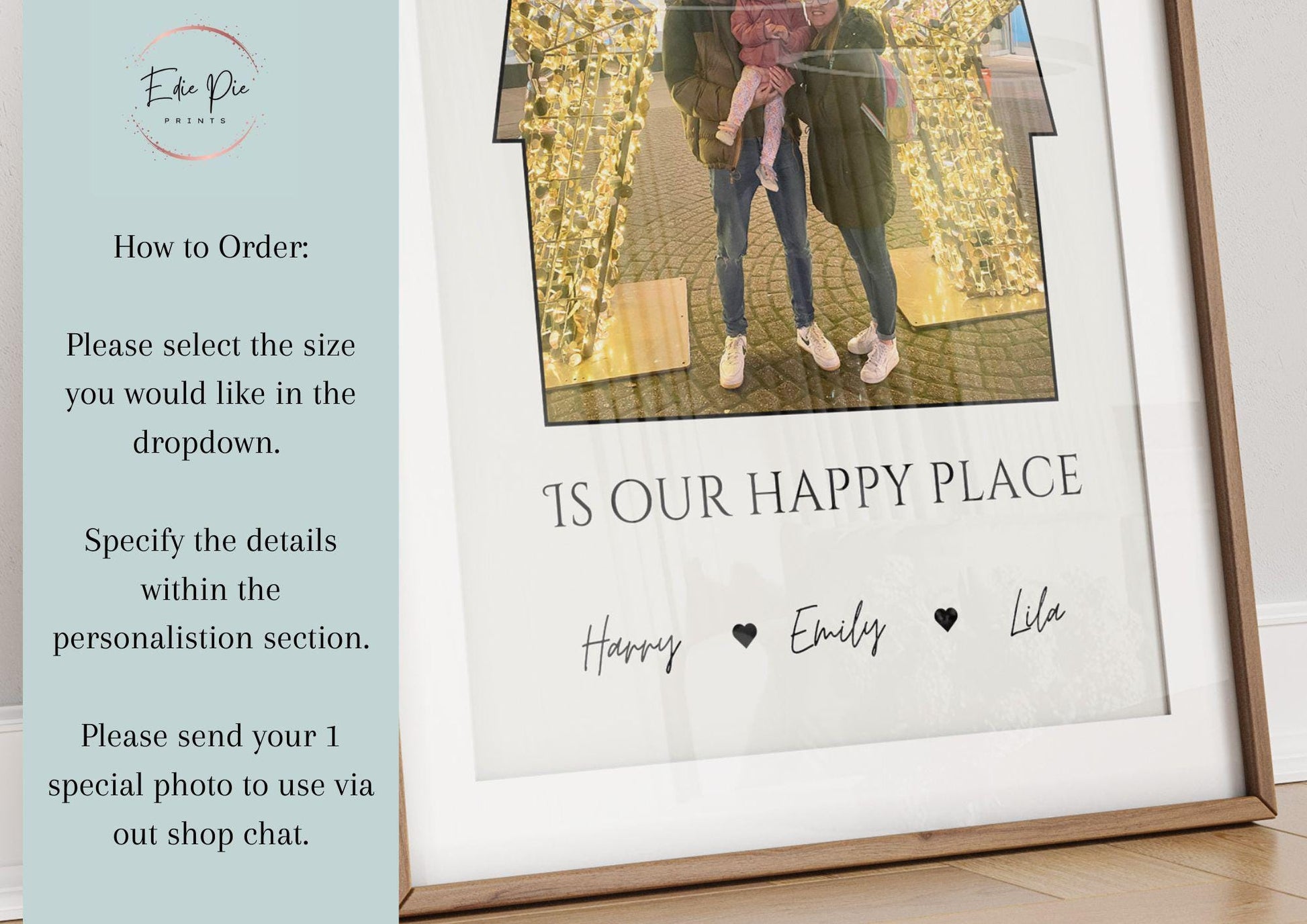 Turn your most cherished memories into a beautiful personalised family print that celebrates the place you call home. Featuring your family photo inside a house-shaped frame with the heartfelt phrase "Home is our happy place," this print makes the perfect gift for loved ones or a stylish addition to your own home decor.