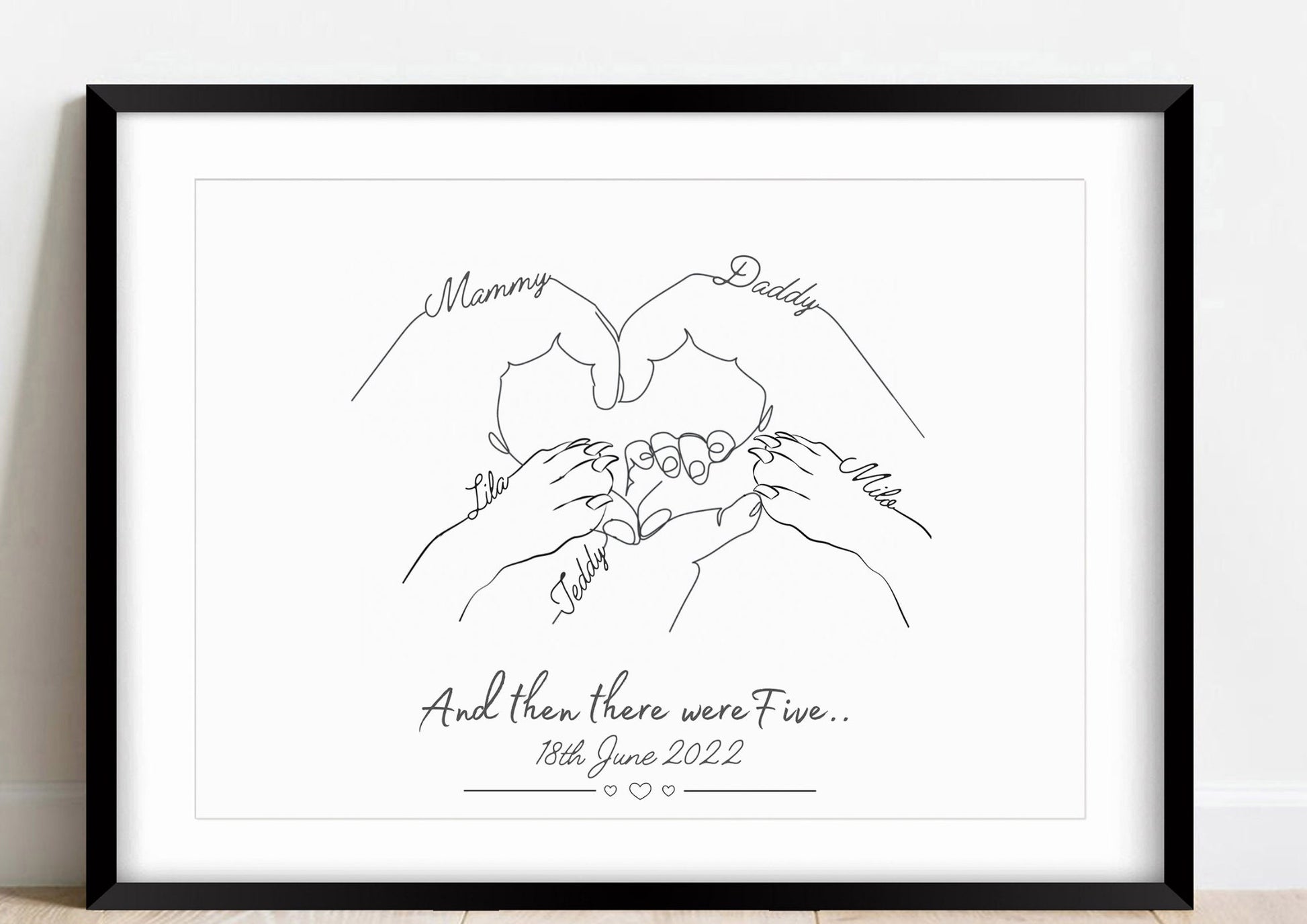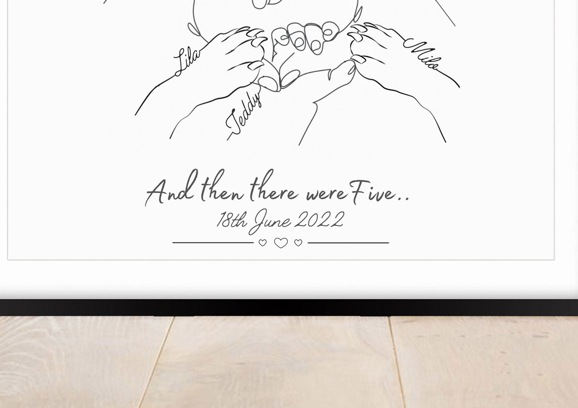 The quote reads 'And then there were five' with the date the baby was born.