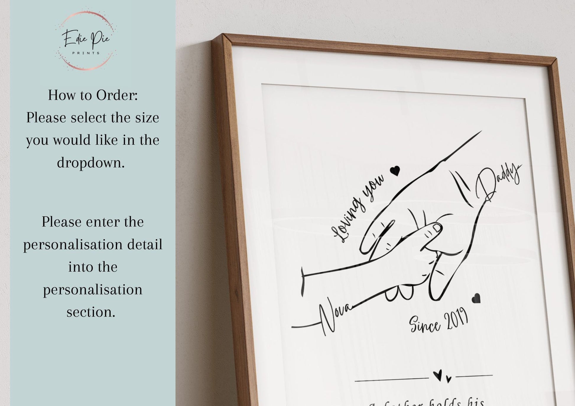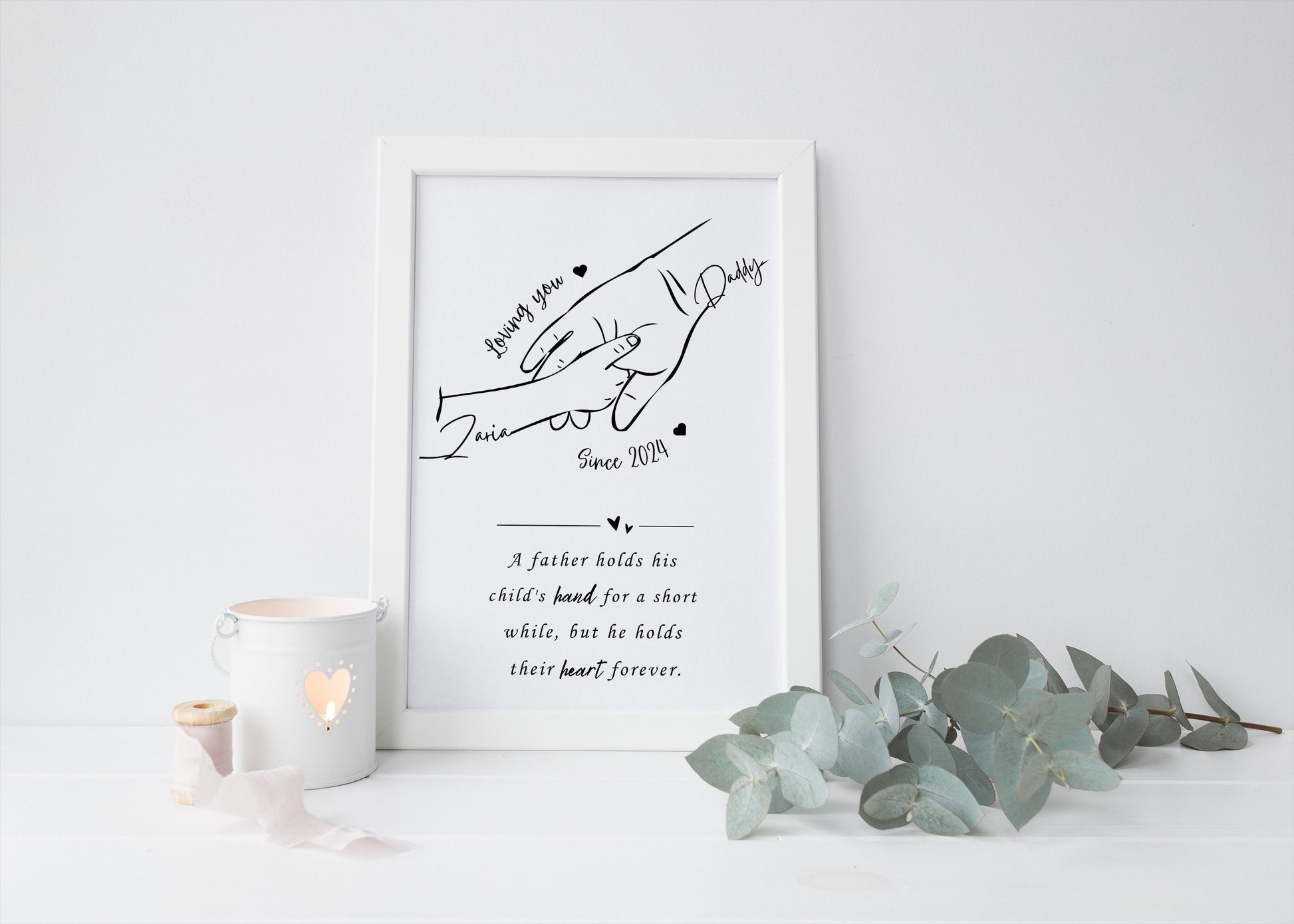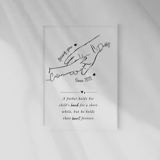 Are you looking for personalised, unique and minimalist line art gift for your loved ones this birthday, christmas, fathers day or any special occasion. This stunning print is the most wonderful gift for any special Daddy. Capturing in vibrant black both Daddy's and childs hand with the name of the child, year they were born and a quote that reads 'A father holds his child's hand for a short while, but he holds their heart forever.'