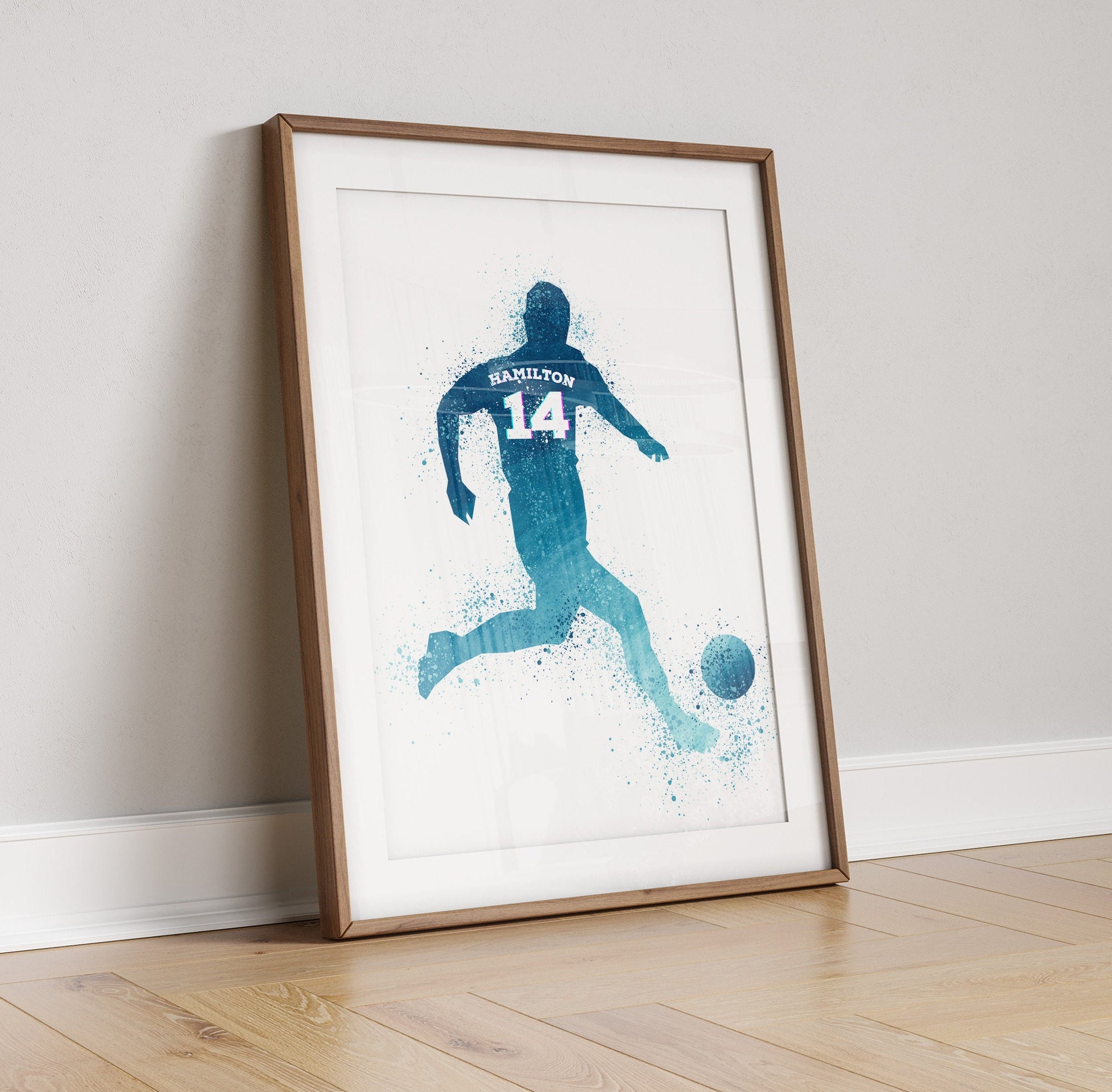 This stunning watercolour boys football player print set is the perfect personalised gift for any football fan in your life. Carptured in stunning vibrant colours and fully customised to your requirements. This is a unique football themed wall art gift for you this year. Sold unframed as a set of 3.