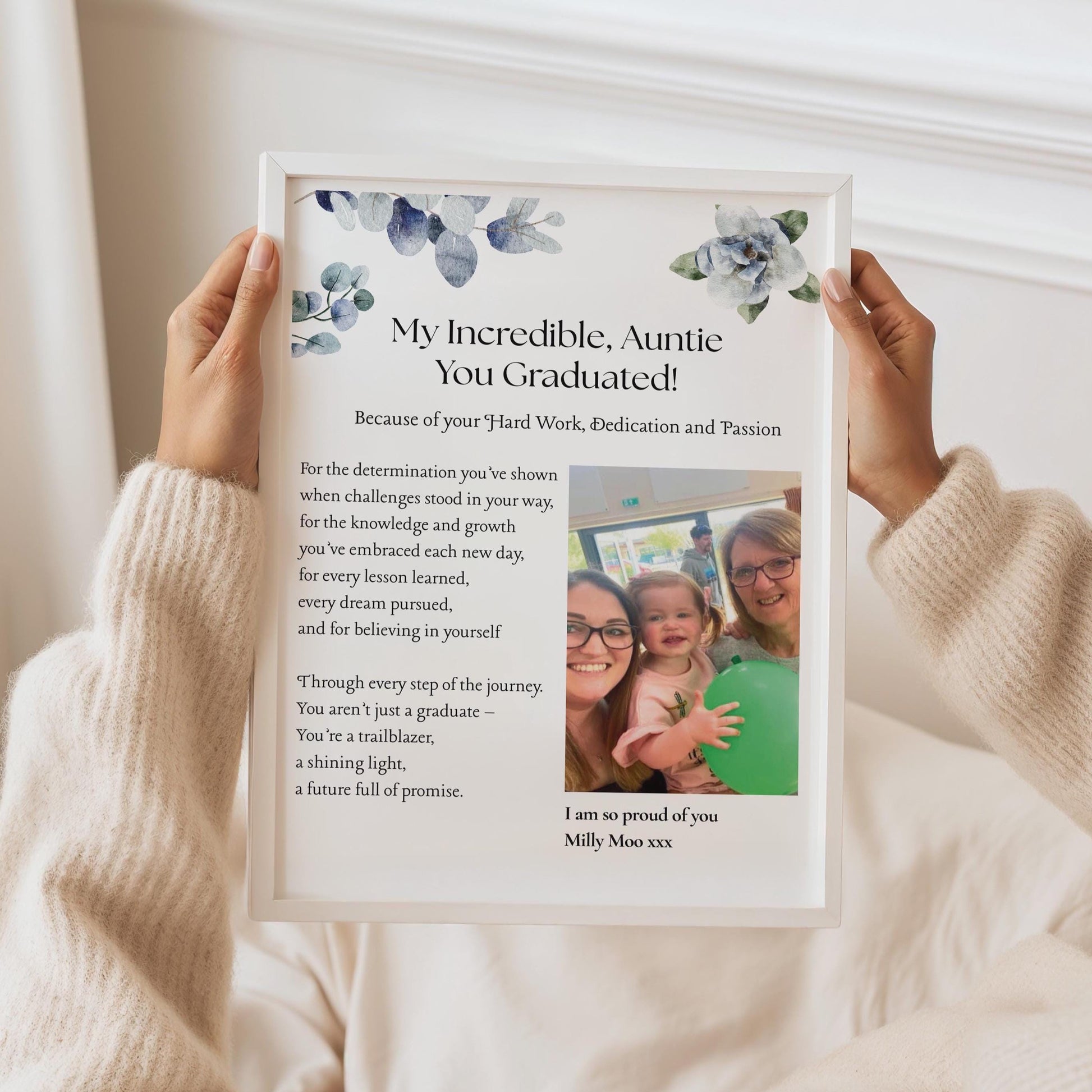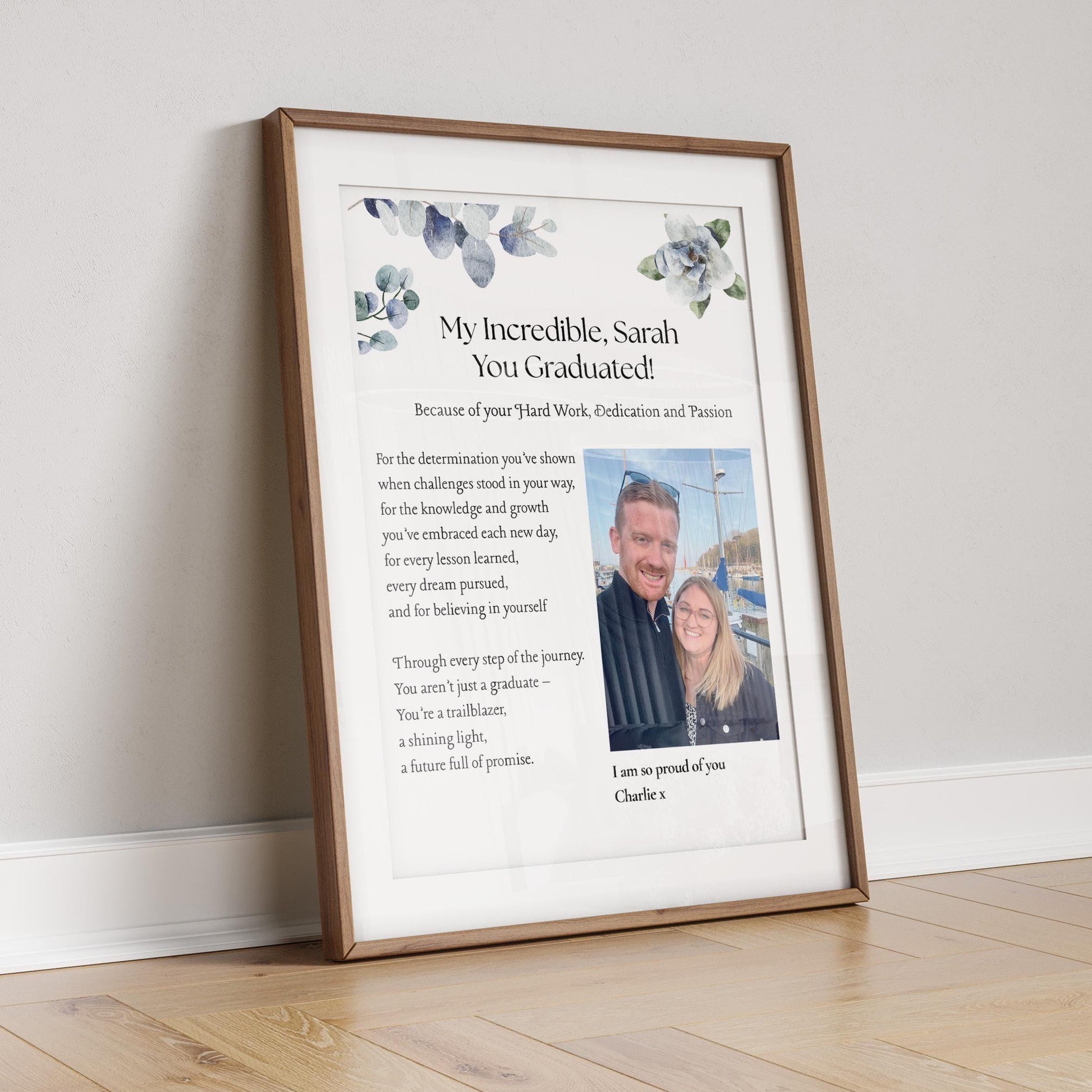 Celebrate your loved one's academic achievement with this beautifully designed personalised graduation print. Featuring a heartfelt poem, your chosen photo, and elegant floral accents, this custom artwork makes a thoughtful keepsake for a daughter, granddaughter, niece, or friend.