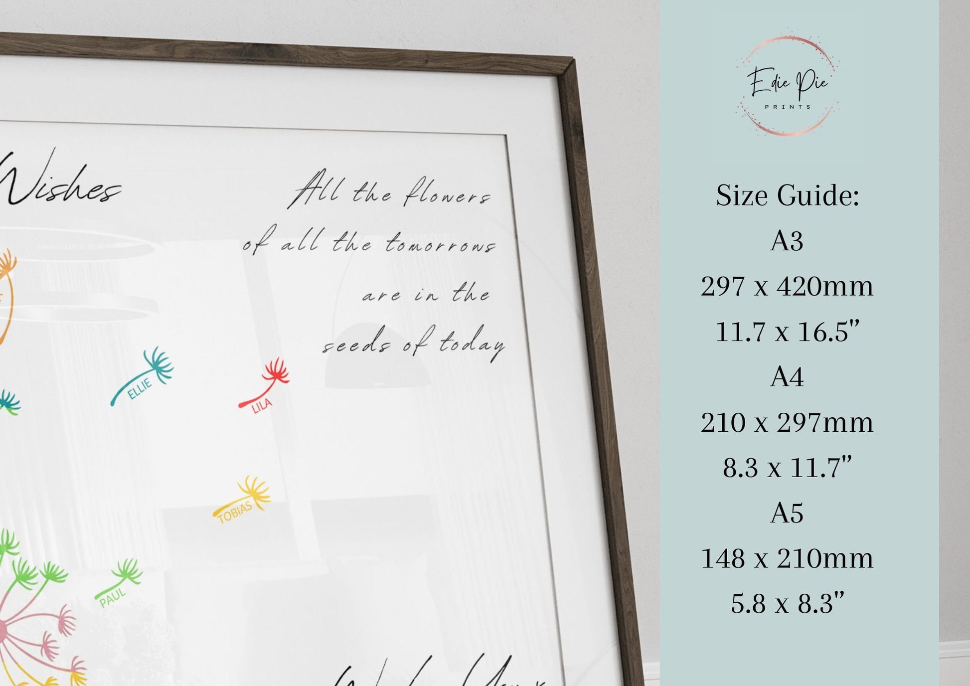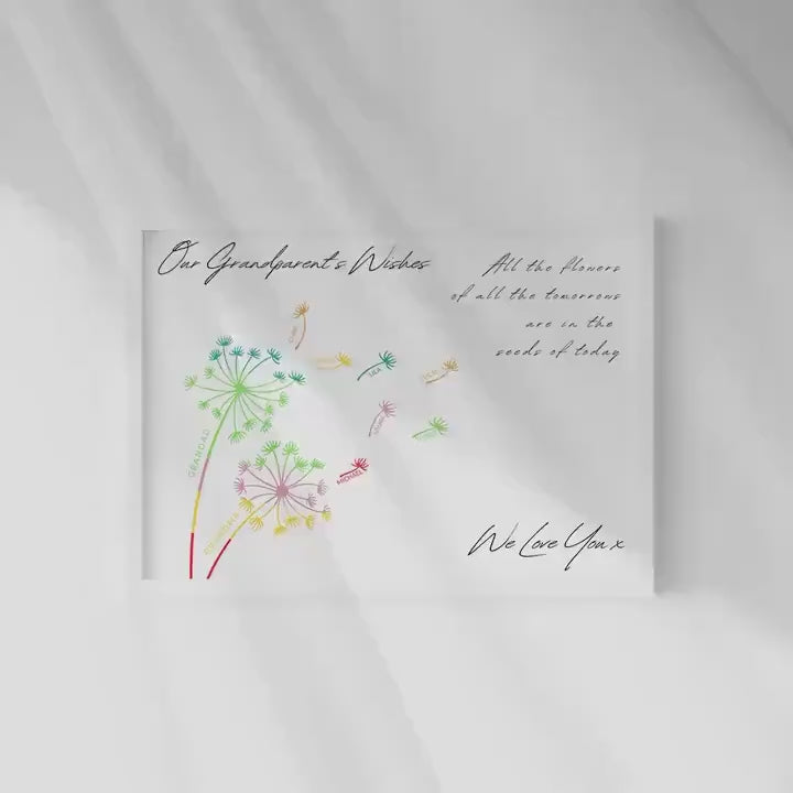 This personalised dandelion print is a thoughtful gift for grandparents, featuring each grandchild's name as a seed blowing in the wind. Designed to celebrate the love and legacy shared between generations, this custom artwork includes names of the grandchildren alongside "Grandma" and "Grandad," with a heartfelt quote: "All the flowers of all the tomorrows are in the seeds of today." Perfect for birthdays, anniversaries, or Grandparents Day, this print adds a personal and meaningful touch to any home. Professionally printed and beautifully framed, it's a cherished keepsake they'll treasure forever.