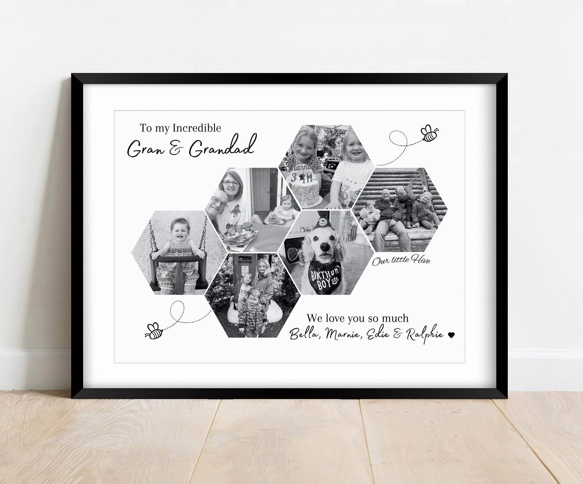 Treat an incredible Gran & Grandad with this sentimental and beautiful customised photo print. Fully personalised to order with photos that capture the wonderful relationship with the Nanny, Gran, Granny, Grandma or Nana and Grandad, Grandpa, Papa and the children/s name and a quote that reads 'Our little Hive'.