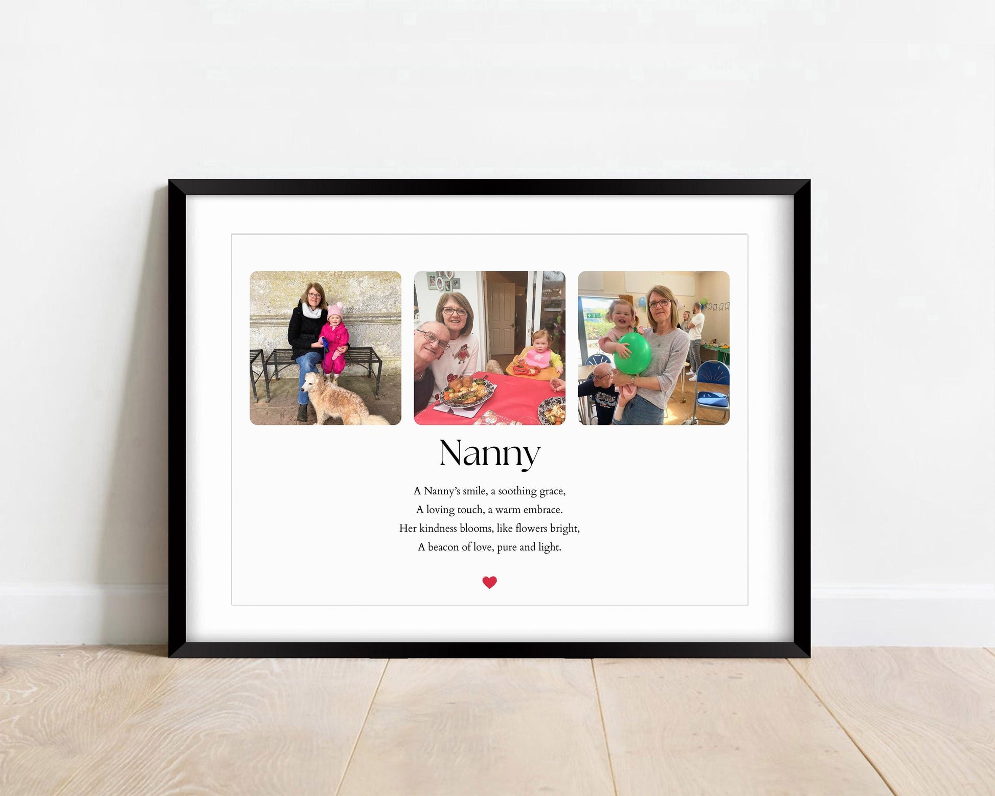 This charming Nana print is the perfect way to celebrate the love, warmth, and grace that grandmothers bring into our lives. Featuring three beautiful photos of a smiling Nana, this print captures her heartwarming presence and gentle spirit. Paired with a touching quote, it reads: