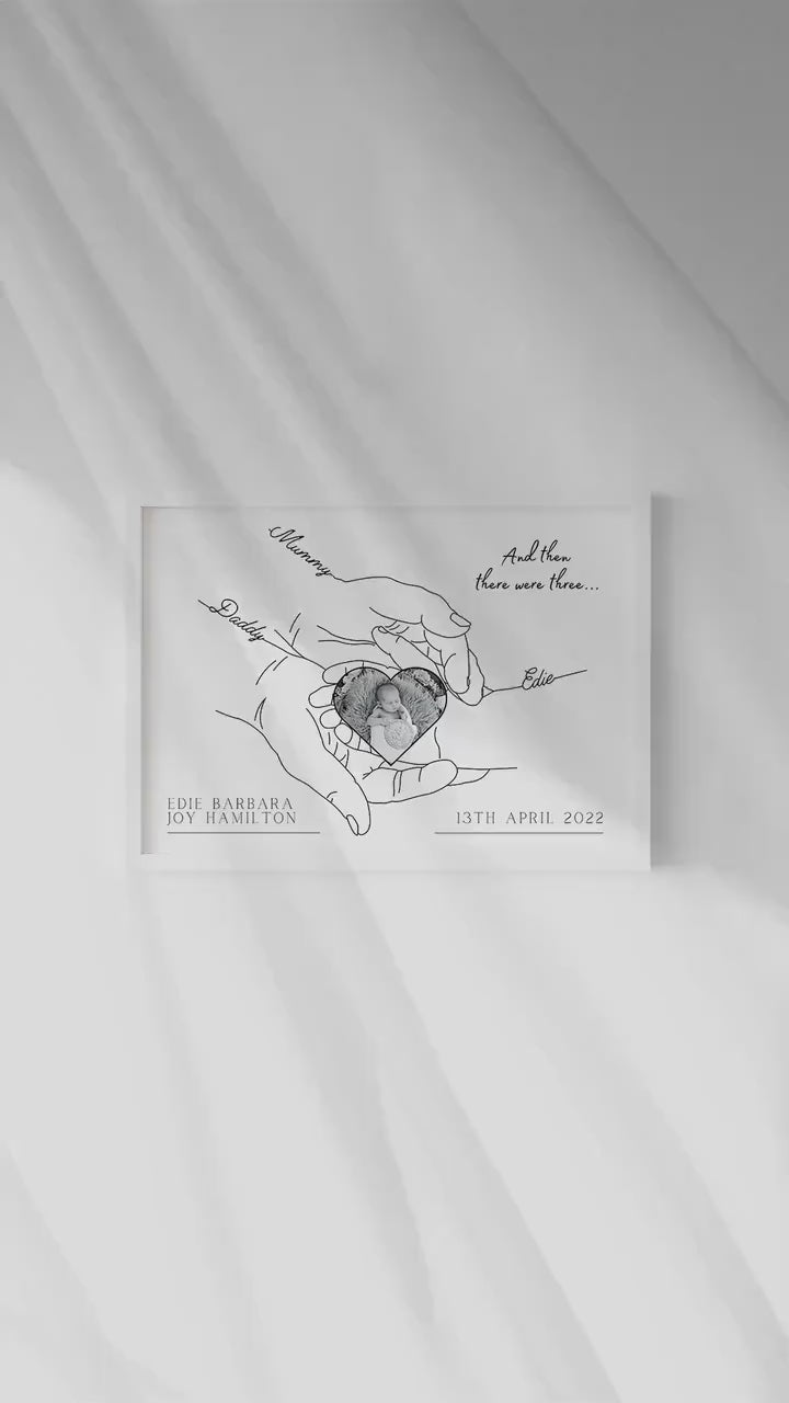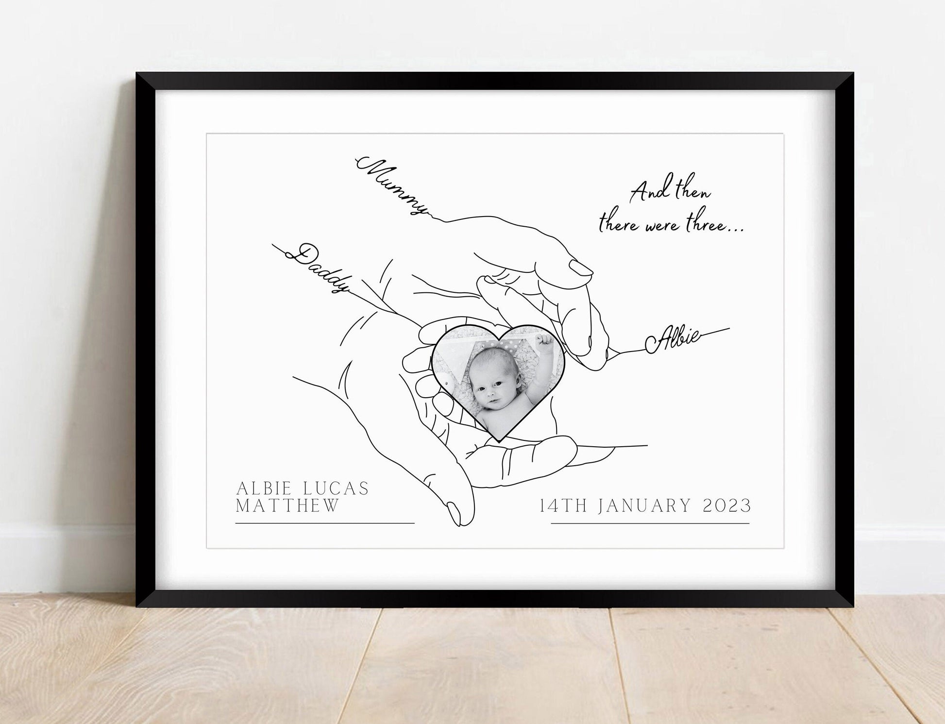 Are you looking for personalised, unique and minimalist line art wall decor to decorate your bedroom or living room walls? Then this is the perfect gift for a special couple in your life. Designed to showcase an infinite line of love with all names joined together. Bringing the wonderful new arrival to the front and centre of this stunning print is a photo of your choice, with the baby name added to the hand and the full name and date if birth dat the bottom.