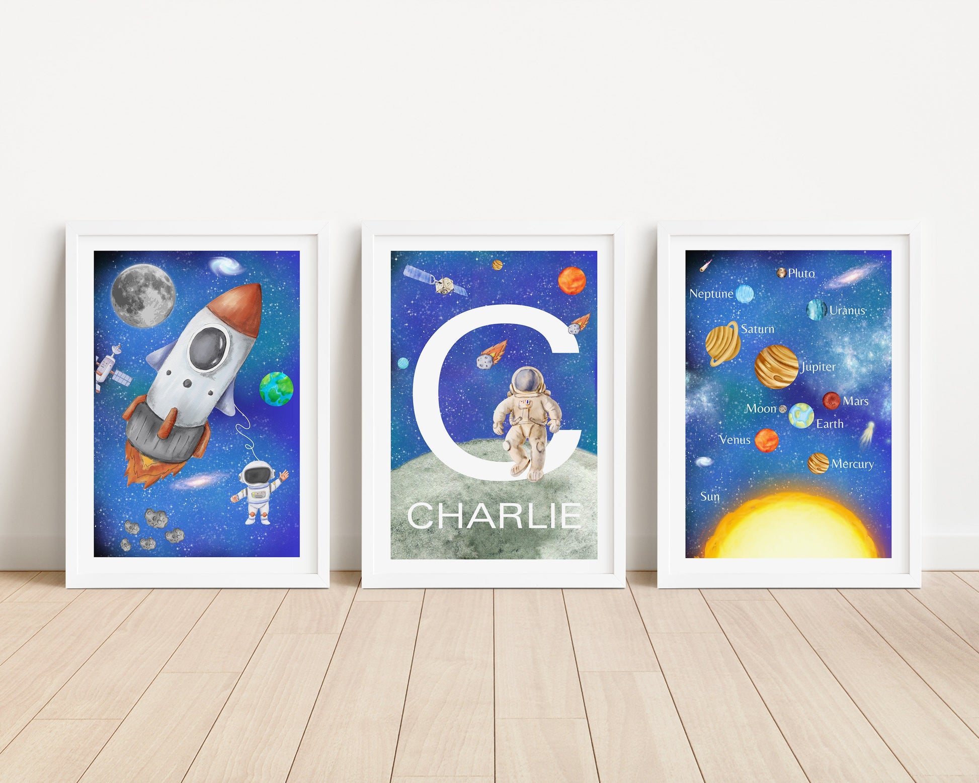 Personalised Space Nursery Print Set, Solar System, Rocket, Astronaut (PDF)