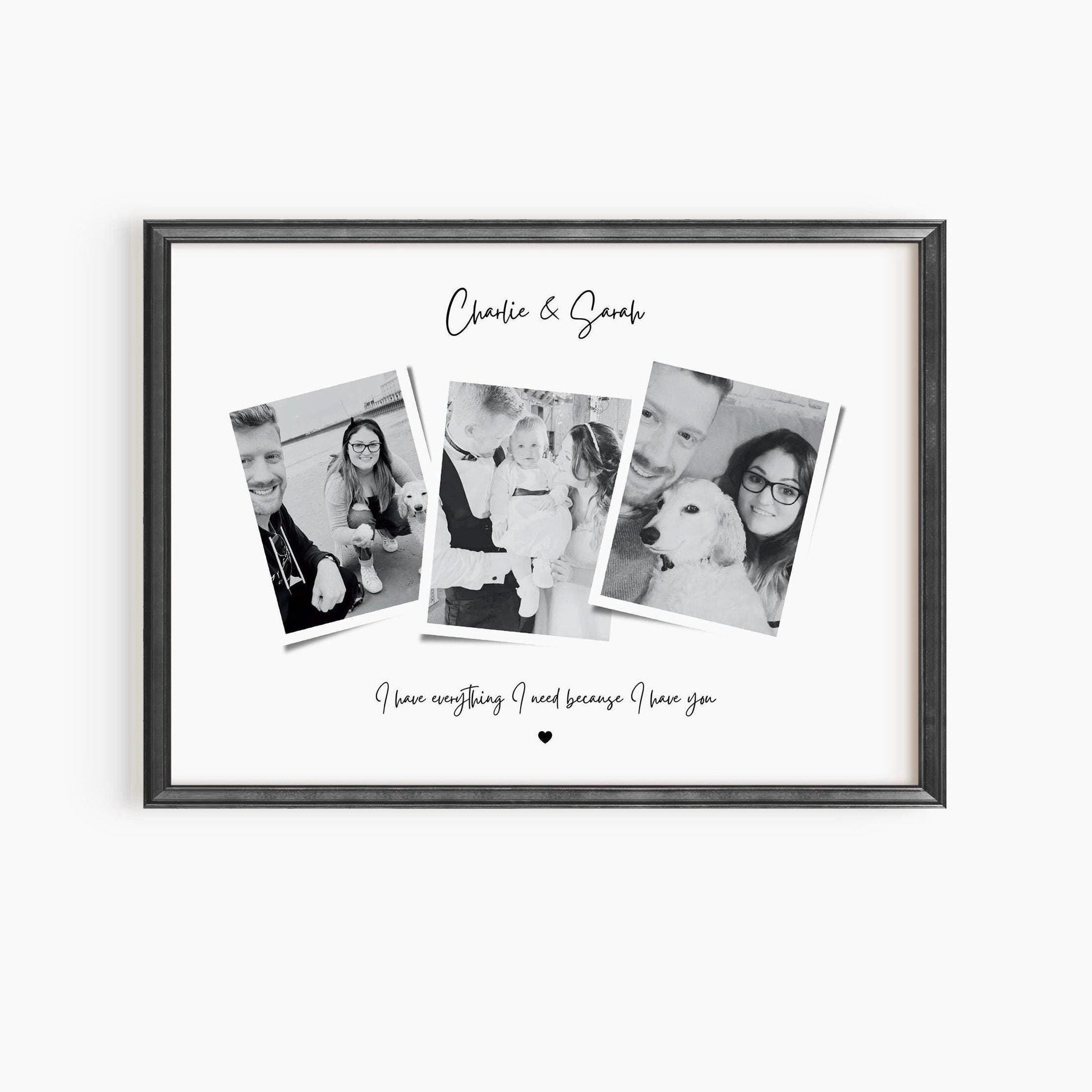 This personalized print beautifully captures the essence of love and connection with a meaningful quote, "I have everything I need because I have you." Featuring three cherished photos, this custom piece can be personalized with the couple's names at the top, making it a perfect gift or keepsake for any special occasion.
