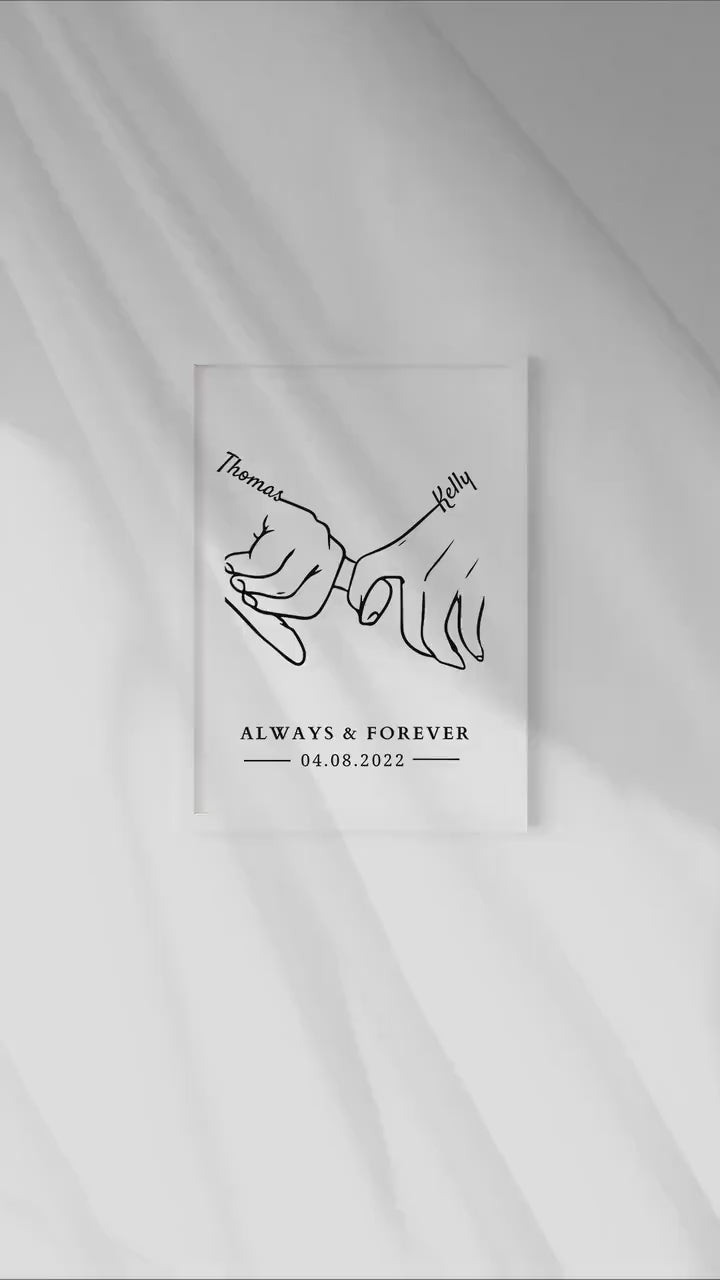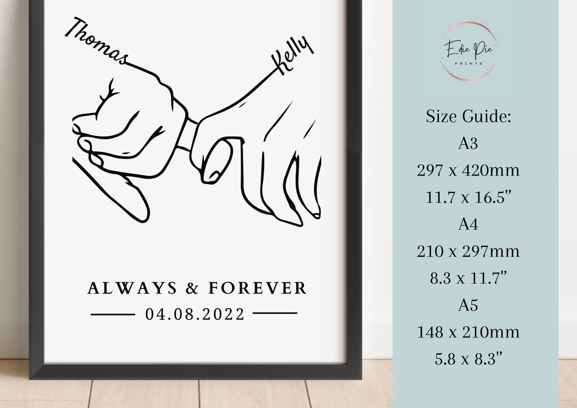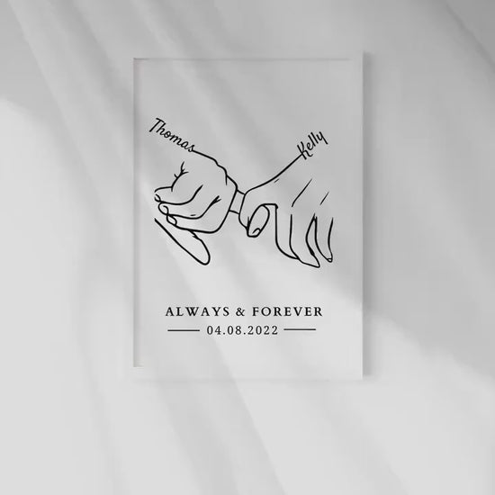 Capture the essence of love and commitment with this minimalist line art print, featuring two hands intertwined in an "Always & Forever" promise. This custom artwork is perfect for couples celebrating a wedding, engagement, anniversary, or any significant relationship milestone. Personalize it with your names and a special date to create a timeless keepsake that beautifully honors your bond.
