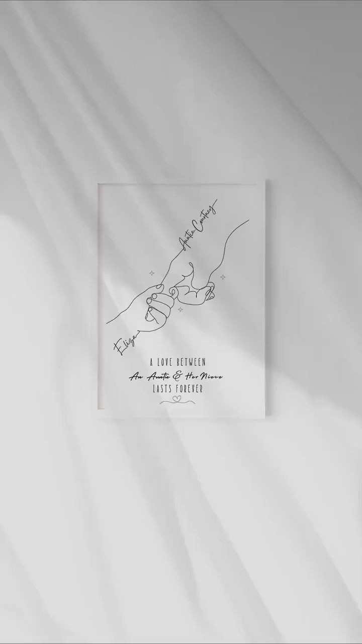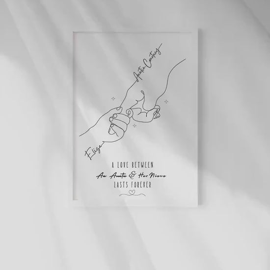 Celebrate the special bond between an auntie and her niece with this beautifully personalised line art print. This custom hand drawing features both names and a delicate minimalist design - perfect for adding a heartfelt touch to a nursery, living room, or bedroom.