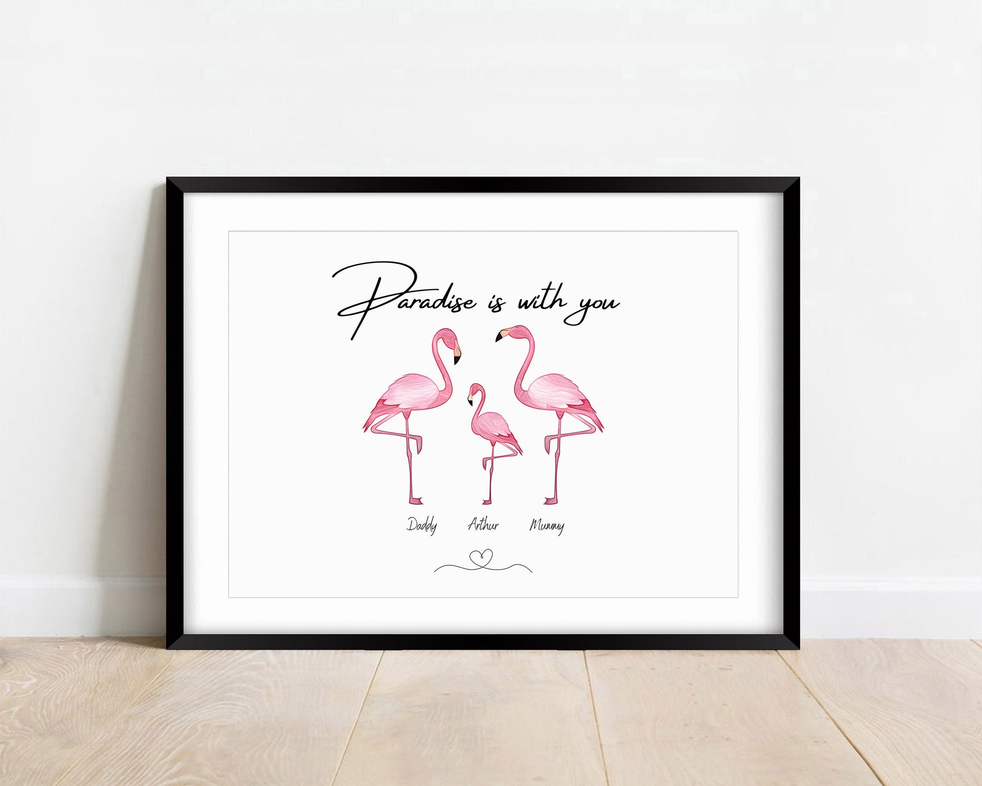 This beautiful Flamingo print is personalised to order and can have up to 6 birds. Each Flamingo can have text of your choice underneath with a quote at the top that says 'Paradise is with you'.