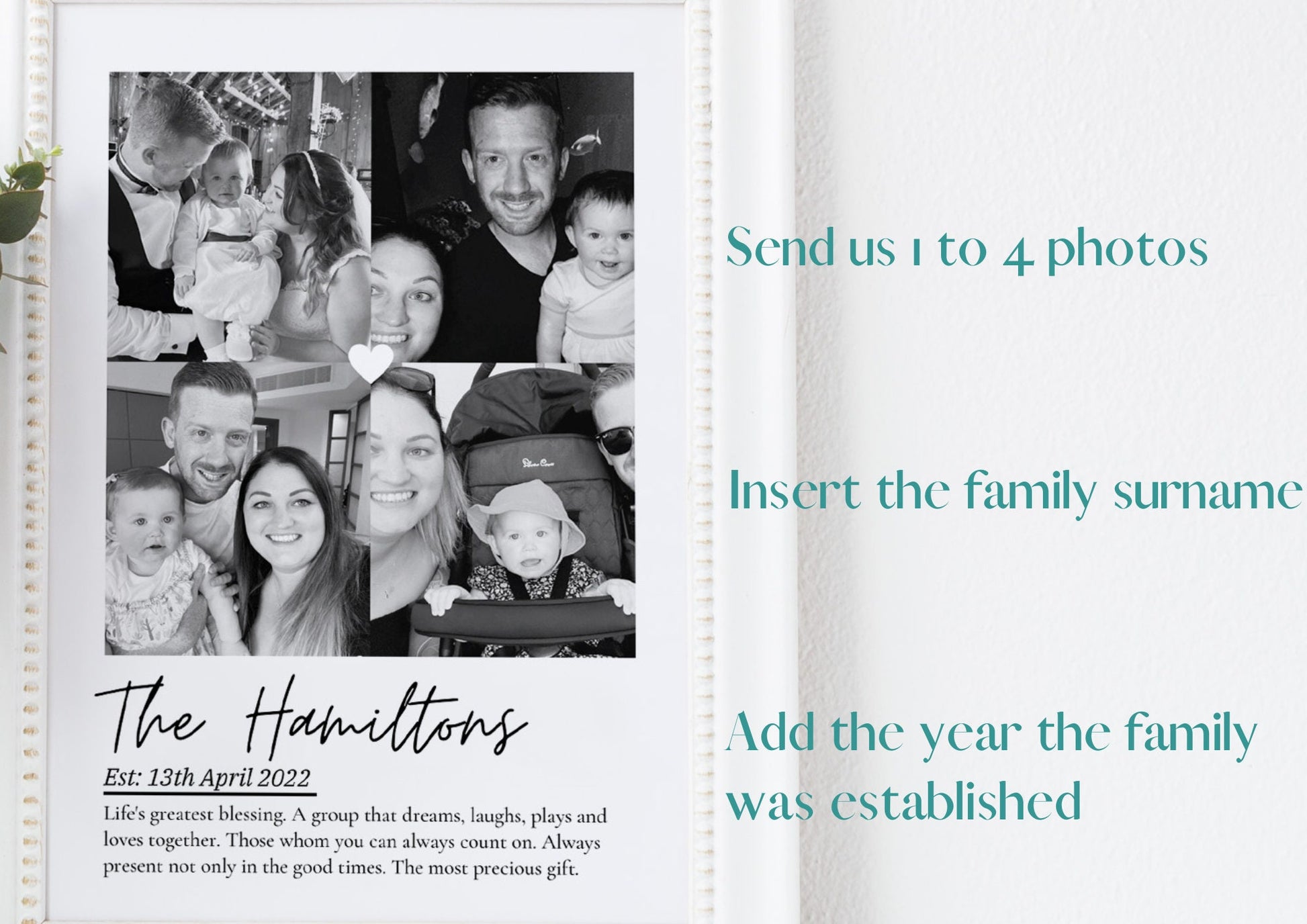 Treat an incredible Family with this sentimental and beautiful customised print. Fully personalised to order with a photo that captures their wonderful relationship including the family surname, the year established date finished off with a quote that reads 'Life's greatest blessing. A group that dreams, laughs, plays and loves together. Those whom you can always count on. Always present not only in the good times. The most precious gift.'