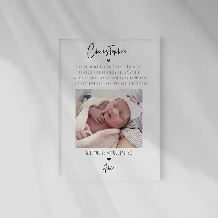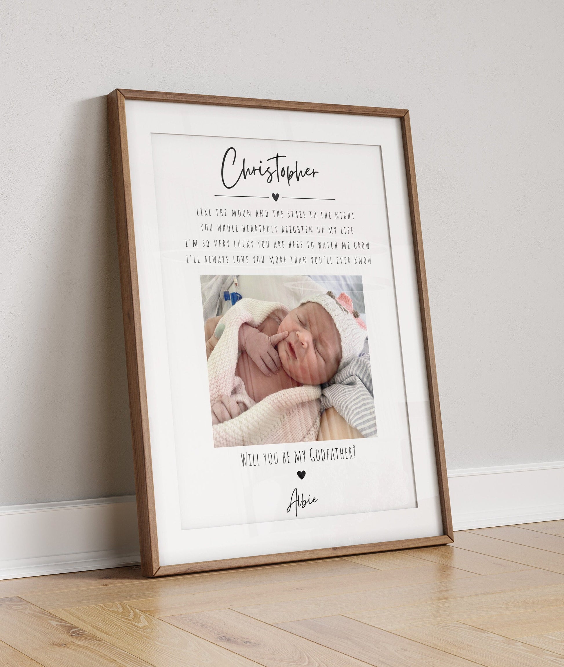 Treat an incredible Godfather to be with this sentimental and beautiful customised print. Fully personalised to order with a photo that captures their wonderful relationship, their name and a beautiful quote that reads 'Like the moon and the stars to the night, you whole heartedly brighten up my life, i'm so very lucky you are here to watch me grow, i'll always love you more than you'll ever know. Will you be my Godfather?'