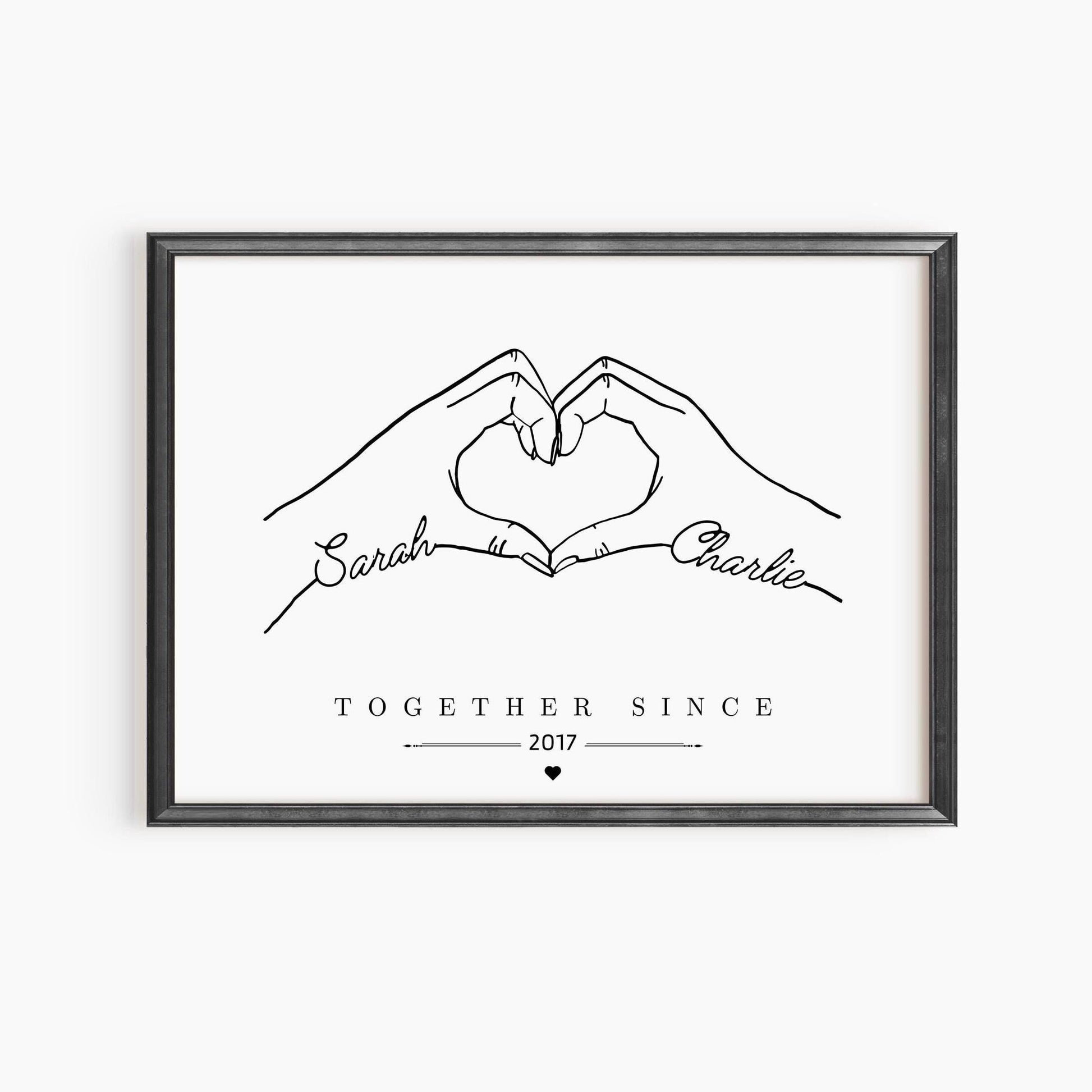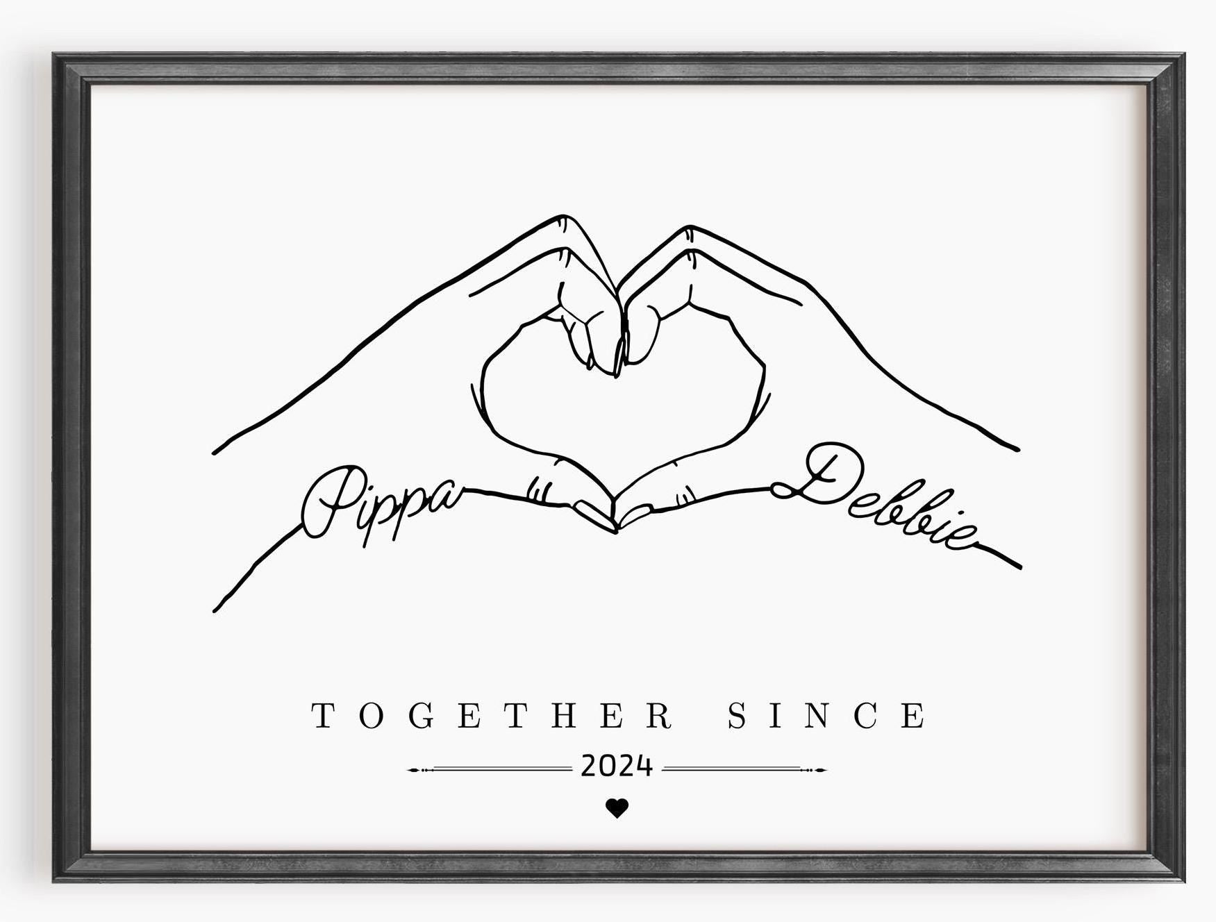 Celebrate your love with this custom minimalist line art print featuring two hands forming a heart. This unique artwork is personalised with your names and the year you became a couple, making it the perfect gift for anniversaries, weddings, or Valentine's Day. Designed in a clean, modern style, this romantic wall art is ideal for home decor in bedrooms, living rooms, or entryways.