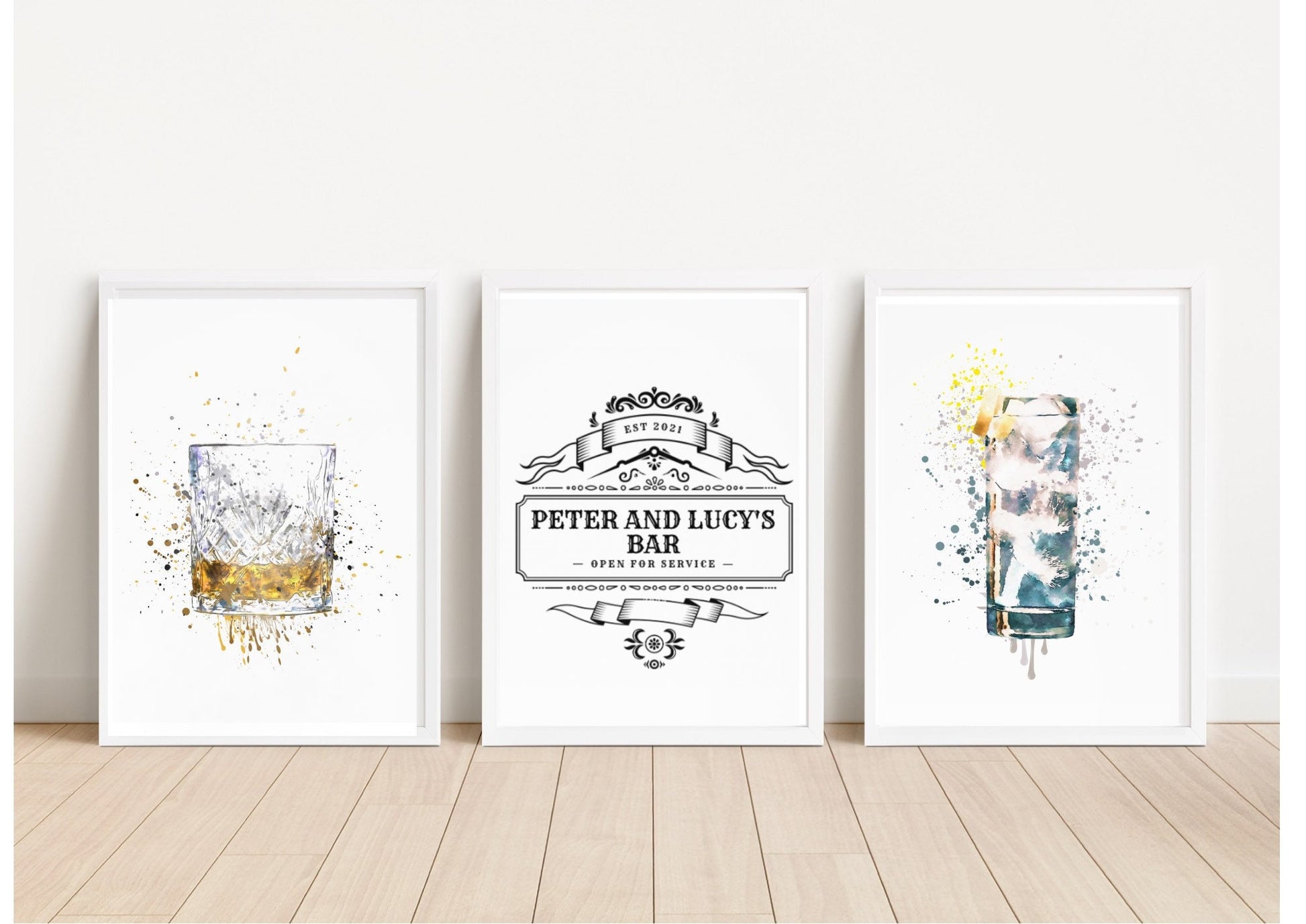 Create a stunning centerpiece for your home bar or man cave with this set of three framed prints. Featuring modern watercolor-style illustrations of a whiskey glass, a cocktail with lemon garnish, and a custom vintage-style bar sign, this art set adds personality and charm to any space. Personalize the center print with names and an established year to make it uniquely yours or gift it to someone special. Perfect for housewarmings, weddings, anniversaries, or bar cart decor.