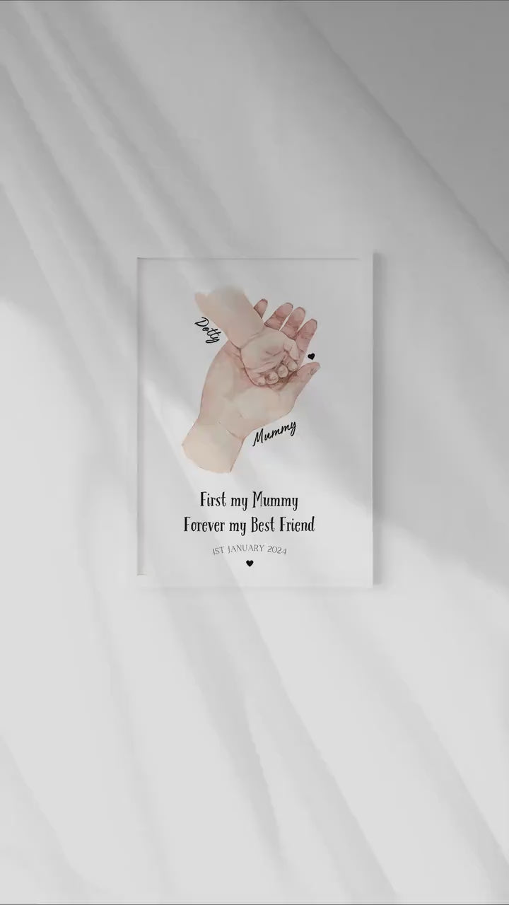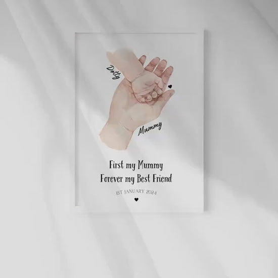 The quote reads 'First my Mummy, Forever my Best Friend' with the childs name and date of birth at the bottom of the design.