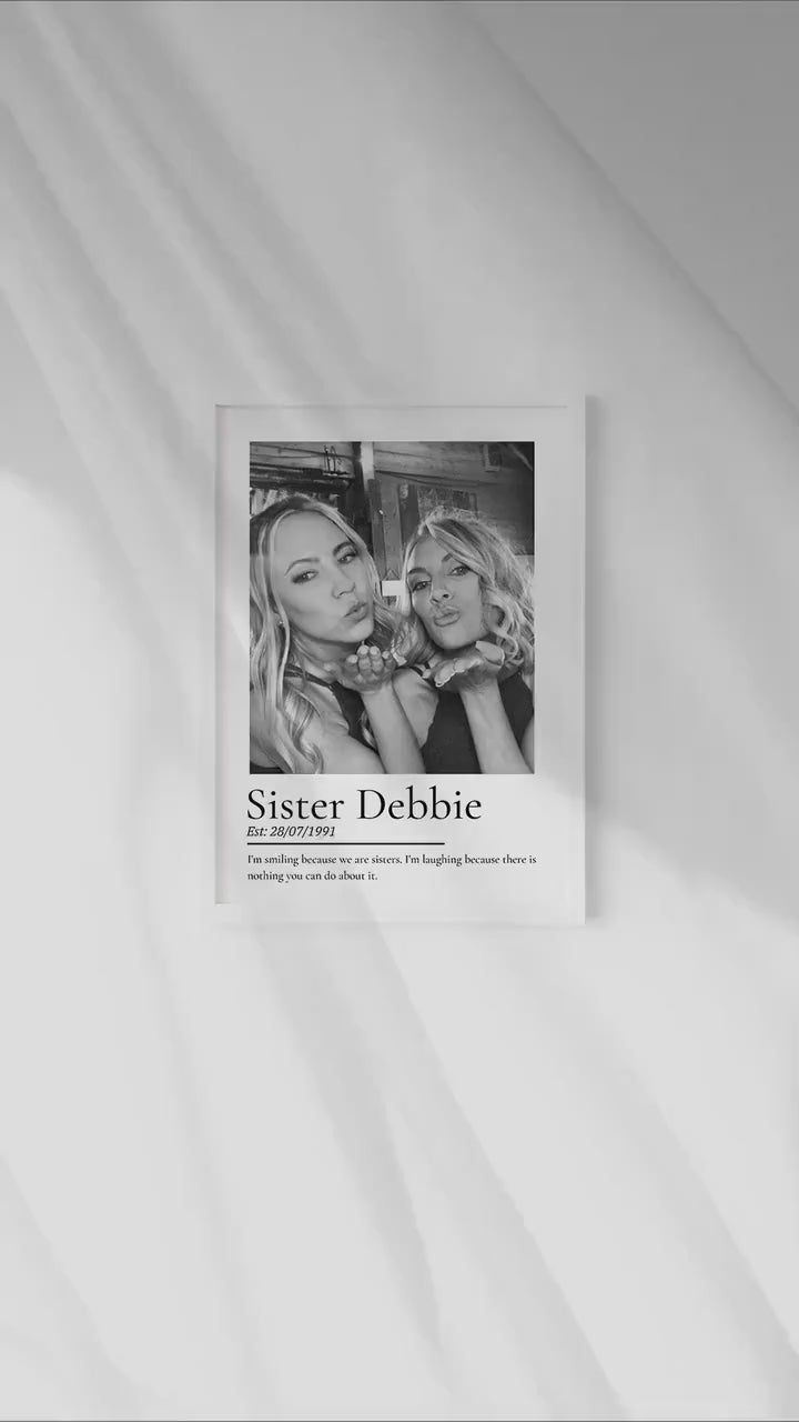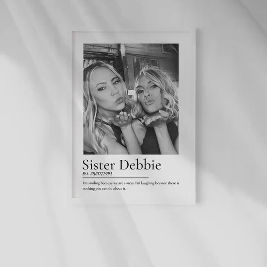 Treat an incredible Sister with this sentimental and beautiful customised print. Fully personalised to order with a photo that captures their wonderful relationship, their name and year established date finished off with a quote that reads 'I'm smiling because we are sisters. I am laughing because there is nothing you can do about it.'